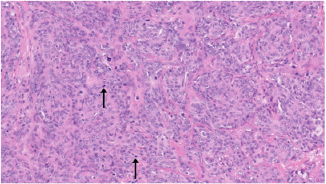 Fig. 4. H&E photomicrograph (20× magnification) of case 4, an angiosarcoma from the bulbar conjunctiva of a pony. Solid nests of neoplastic epithelioid cells devoid of vascular channel formation. Frequent mitoses are evident (arrows). Moderate to marked cellular pleomorphism and nuclear atypia were seen in all cases. Mitoses per 10HPF (2.73 mm2), varied from 3 to 34 per HPF, with case 4 displaying the highest number of mitoses and the only case with metastatic spread (Fig. 4). Solar elastosis was seen in five cases (Fig. 5). In the two horses diagnosed with conjunctival angiosarcoma, the histopathological findings reflected malignant conjunctival neoplasms that were poorly differentiated with regards to lineage. Both of these neoplasms had a solid epithelioid growth pattern and an absence of vascular channel formation, but vascular lineage was suspected given the location and H&E morphology of the tumour, accompanying perivascular lymphonodular aggregates and absence of overlying surface epithelial pathology with regards to dysplastic or neoplastic changes to indicate carcinoma (Fig. 6). IHC was performed in these two cases in an attempt to rule out the differential diagnosis of carcinoma and confirm vascular lineage as a requirement for further tumour identification (Fig. 7). IHC was performed retrospectively in all cases to investigate for concordance and to assess the value of immunohistochemical staining. Von Willebrand Factor (vWF, a vascular endothelial marker) was applied in all cases; vimentin (generalised mesenchymal marker) and cytokeratin (epithelial marker) were applied in the two poorly differentiated tumours at the time of diagnosis.