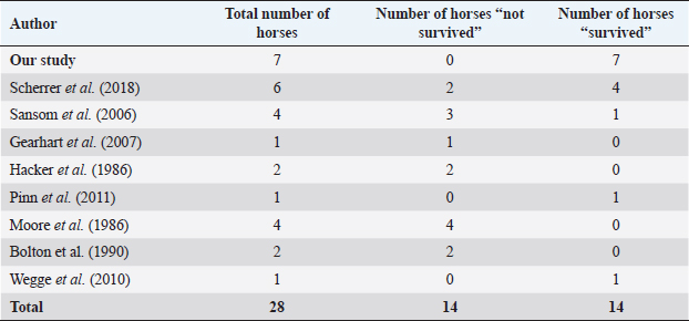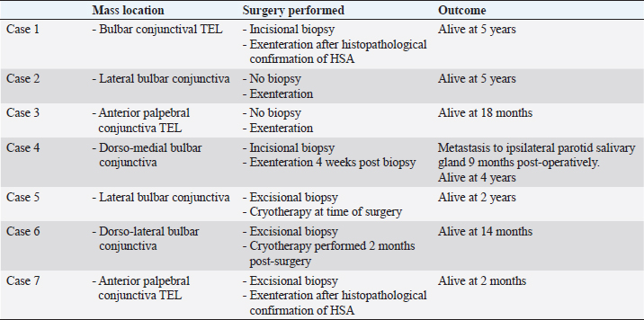ABSTRACTBackground: Only 27 cases of equine conjunctival haemangiosarcoma have been reported in the literature over the past 37 years. Out of these, 22% of cases were lost to follow-up, 52% were euthanized, and 26% survived. A scarcity of cases and information is available for this rarely seen conjunctival tumour. Aim: To describe the clinical features, management, and outcome of conjunctival hemangiosarcoma in seven horses in the UK. Methods: Optivet medical records were reviewed for equine cases seen or advised on with a histopathological diagnosis of conjunctival haemangiosarcoma between January 2013 and March 2023. Medical records were accessed for details of signalment, history, management, and follow-up. Histopathology was used to confirm the diagnosis of haemangiosarcoma and assess the surgical margins. Immunohistochemistry was performed in a minority of cases with poorly differentiated solid tumours to support vascular lineage. Results: Seven eyes from seven horses (five geldings and two mares) with a mean age of 16 years and median of 18 years (range 10–21 years) met the criteria. Serosanguinous discharge was seen in six eyes. All eyes were managed surgically; 4 by exenteration and 3 by conjunctivectomy/keratectomy. Adjunctive cryotherapy was performed in two eyes. Metastatic disease in the ipsilateral parotid salivary gland, confirmed with histopathology, was seen in one horse. Surgical margins were clear in all but one eye. Solar elastosis was noted in five eyes. All horses were healthy at the last follow-up (0.2–5 years, mean 2.9 years, and median 2 years). Conclusion: Equine conjunctival haemangiosarcoma is rare. Serosanguinous ocular discharge is a common clinical sign. Early surgical excision is highly effective. Solar elastosis is a common histopathological feature, suggesting a role for UV-light in the pathogenesis. Keywords: Haemangiosarcoma, Solar elastosis, Horse, Vascular tumour, Ocular tumour. IntroductionPrimary tumours of vascular origin arise from the endothelium of blood or lymph vessels and can be benign or malignant. The equine eye is rarely affected, and both adnexal and intraocular forms have been reported (Hargis et al., 1978; Bolton et al., 1990). Primary conjunctival vascular tumours have been reported infrequently in several species including the cat (Multari et al., 2002; Pirie and Dubielzig, 2006), dog (Liapis and Genovese, 2004), horse (Vestre et al., 1982; Hacker et al., 1986; Moore et al., 1986; Bolton et al., 1990; Sansom et al., 2006; Gearhart et al., 2007; Wegge et al., 2010; Pinn et al., 2011; Scherrer et al., 2018), cow (Sutton and McLennan, 1982; Ruggles et al., 1992), giant panda (Lopez et al., 1996), and humans (Honavar and Manjandavida, 2015). They originate from the endothelium of blood vessels within the conjunctiva associated with the limbus, the medial and lateral canthus, the third eyelid (TEL) and, rarely, from the cornea. The single report of primary corneal haemangiosarcoma postulated an origin from corneal neovascularization (Lavach and Severin, 1977; Vestre et al., 1982; Hacker et al., 1986; Crawley et al., 1987; Bolton et al., 1990). They are classified histologically as benign (haemangioma) or malignant (haemangiosarcoma) (Knottenbelt et al., 2015). Dogs are the most commonly affected species (Hargis et al., 1978; Pirie et al., 2006), and the lateral bulbar conjunctiva and the leading edge of the TEL are the most frequent locations (Hargis et al., 1978; Peiffer et al., 1978; Peiffer and Terrell, 1978; Pirie et al., 2006). Definitive diagnosis requires histological examination following biopsy (incisional or excisional), and the treatment of choice is surgical excision (Pirie et al., 2006). The prognosis in dogs is good; there is a risk of local recurrence, but metastatic disease has not been reported (Hargis et al., 1978; Peiffer et al., 1978; Peiffer and Terrell, 1978). The most common ocular and adnexal tumour in horses is squamous cell carcinoma (SCC) (Lavach and Severin, 1977; Gearhart et al., 2007; Scherrer et al., 2018); it is also the second most common cutaneous tumour (Sundberg et al., 1977). Other tumours that present in the equine conjunctiva include papilloma, melanoma, mastocytoma, basal cell carcinoma, schwannoma, adenoma and adenocarcinoma, haemangioma, and haemangiosarcoma. Older horses are predisposed (Sansom et al., 2006; Scherrer et al., 2018), and a serosanguinous ocular discharge is the main clinical feature (Sansom et al., 2006; Scherrer et al., 2018). Treatments have included surgical excision, enucleation, exenteration, surgical debulking with adjunctive therapies, radiation alone and euthanasia (Moore et al., 1986; Sansom et al., 2006; Scherrer et al., 2018). Adjunctive therapies included β-irradiation with strontium90, iridium191, brachytherapy, and cryotherapy (Hacker et al., 1986; Moore et al., 1986; Bolton et al., 1990; Sansom et al., 2006). Haemangiosarcoma is rare, with only 27 cases reported over almost four decades since 1986 (Hacker et al., 1986; Moore et al., 1986; Bolton et al., 1990; Sansom et al., 2006, Gearhart et al., 2007; Wegge et al., 2010; Arenas-Gamboa and Mansell, 2011; Pinn et al., 2011; Scherrer et al., 2018). From these 27 cases, six were lost to follow-up (Arenas-Gamboa and Mansell, 2011), 14 were euthanized (Hacker et al., 1986; Moore et al., 1986; Bolton et al., 1990; Sansom et al., 2006; Scherrer et al., 2018), and seven survived (Sansom et al., 2006; Wegge et al., 2010; Pinn et al., 2011; Scherrer et al., 2018). The seven surviving cases were all reported in more recent years (2006 onwards) when the aggressive nature of ocular and periocular haemangiosarcomas was becoming more apparent (Sansom et al., 2006; Wegge et al., 2010; Pinn et al., 2011; Scherrer et al., 2018) and treatment options were advancing. Local recurrence and confirmed metastatic disease to the ipsilateral retropharyngeal lymph node has been reported in one horse (Gearhart et al., 2007); however, further