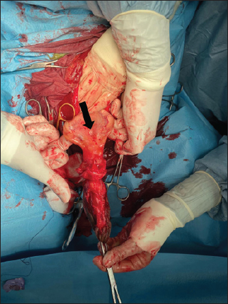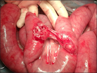 Fig. 1. Bladder rupture in the dorsocranial portion of the urinary bladder in Case 1. Black arrow: bladder tear. The bladder was exposed by traction on the urachus and a 2-cm tear in the dorsocranial margin was revealed (Fig. 1). The tear was closed with a 2–0 glycolide dioxanone monofilament (BiosynTM) using a two-layer inverting suture pattern. Umbilical arteries’ remnants were ligated at the level of the urachal resection and a transverse incision was made across the apex of the bladder to remove the urachus and bladder apex. The incision was closed using a two-layer inverting suture pattern with a 2–0 glycolide dioxanone monofilament (BiosynTM). The bladder closure was tested for leaks by carefully retrograde introduction of 200 ml of sterile saline solution. The Foley urinary catheter was left in place and the abdominal cavity was lavaged with 5 l of warm sterile saline solution. Linea alba was closed with 1 glycole/lactide copolymer absorbable suture (PolysorbTM) with a simple interrupted pattern; the subcutaneous tissue and skin were closed in routine fashion with 0 glycole/lactide copolymer absorbable suture (PolysorbTM) and 0 monofilament nylon (MonosofTM), respectively. After the surgery, the foal’s vital parameters remained within physiological limits and the animal continued to urinate through the urinary catheter. Preoperative therapy was continued. Three days after the surgery, the colt appeared depressed, with a distended abdomen. Ultrasonography of the abdomen showed free fluid in the peritoneal cavity and the cystoscopy showed another tear in the dorsal wall of the bladder, further caudad to the original repair. No signs of suture failure were highlighted. Due to the localization of the tear and for financial reasons, surgical correction was excluded and conservative treatment was preferred. A closed drainage system consisted of a 32F chest tube (REDAX S.r.l., Poggio Rusco (MN), Italy), attached to a Christmas tree connector (Vygon Italia S.r.l, Padova, Italy) closed by a perforable cap (Farmac-Zabban S.p.A, Calderara di Reno (BO), Italy), was placed into the peritoneal cavity at the most ventral aspect of the abdomen, 5 cm to the left midline. The catheter was fixed to the abdominal wall by a 0 nonabsorbable monofilament suture (DafilonTM), with a Chinese finger trap suture. The abdomen was lavaged with 2 l of sterile saline solution twice daily for 2 days. Poor return and normal ultrasound images were noted on day 2, so the abdominal drain was removed. On day 8 after surgery, the urinary catheter was removed, and the colt started to urinate normally. A cystoscopy was repeated on day 10, in which the closure of the tear was confirmed. Blood gas analysis was monitored on alternating days for 4 days and by day 2, all values were within normal limits. Antibiotic therapy was suspended on day 17. The colt was discharged 29 days following admission. Complications after hospital discharge and long-term outcome Two months after hospitalization, the foal was referred to the hospital with signs of pain, abdominal distention, sweating, and the presence of gastric reflux from the nostrils. The patient was depressed, tachycardic (80 ppm), and tachypneic (60 bpm), with congestive mucous membranes and increased capillary refill time (4″). Ultrasound examination showed an immotile, distended, thickened small intestine, without free fluid in the abdomen. Exploratory laparotomy under general anesthesia was performed and revealed multiple adhesions between the abdominal wall and the small intestine, areas as well as necrotic patches in the small intestine, (Fig. 2). According to the owner, due to a guarded prognosis, euthanasia was performed. Case 2History and clinical findings A 2-day-old Quarter Horse foal weighing 46 kg was presented to the Equine Clinical Service with depression, tenesmus, frequent urination, preputial edema, and umbilical hernia. The foal’s delivery had been assisted by the owners, due to the absence of contractions by the mare. The colt received adequate colostrum after birth and passed meconium. Physical examination showed depression, absence of suckling reflex, abdominal distention, opisthotonus, and lingual ptosis; the colt was hyperthermic (39.4℃), tachypneic (56 bpm), tachycardic (112 bpm). The hematic concentration of glucose was elevated (12.88 mmol/l) (6.11–7.83 mmol/l) (Lumsden et al., 1980); lactate level at the admission was elevated (19.4 mmol/l) (11–2.3 mmol/l) (Castagnetti et al., 2010), but decreased during hospitalization. Serum IgG concentration was normal (1,865 mg/dl) (>800 mg/dl) (Liepman et al., 2015).