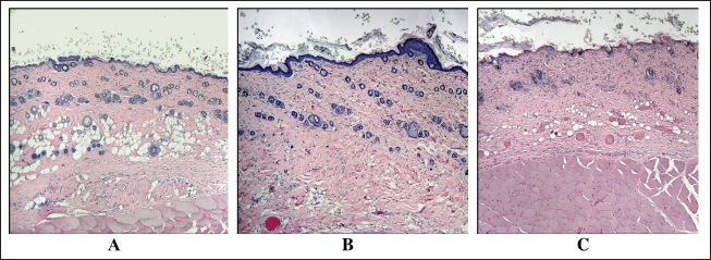 Fig. 1. Fragments of the skin of the control group on the 10th day of the experiment (A), as well as 10 days (B) and 3 months (C) after a single local irradiation with electrons at a dose of 40 Gy. H&E stain, magn. ×100.