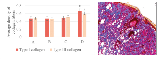 Fig. 4. The average density of types I and III collagen fibers in the skin after 3 months (left). A–control; B–single irradiation, 8 Gy; B–single irradiation, 40 Gy; G–fractional, 78 Gy. #–significant difference (p < 0.05) compared to the control. Group IV skin fragment 3 months after 78 Gy fractional irradiation. Masson stain, magn. ×200 (right). Fractionation 78 GyMicroscopic analysis The epithelium is partially absent, the dermal papillary layer is smoothed and intensely infiltrated with polymorphonuclear leukocytes, edema of the dermal reticular layer and hypodermis, collagen fibers are loosened, dilated blood vessels with endothelial detachment, aggregation, and sludge of erythrocytes were noted 10 days after 78 Gy fractional local electron irradiation, as well as the sebaceous glands and hair follicles, are destructured (Table 3). After 3 months fractional irradiation led to the growth of the connective tissue component of the skin with signs of RIF: a pronounced thickening of the dermis and hypodermis, the absence of hair follicles, and the complete or partial absence of sebaceous and sweat glands (single preserved glands are strongly destructured). Compared with the results of a morphometric assessment of the skin of the same group (IV) after 10 days, there was a weak restoration of the epidermis, a slight decrease in the thickness of the dermis (by 36.6%), and hypodermis (by 9.8%) (Table 4). Histochemical analysis According to Masson and safranin staining, fractional electron irradiation led to a pronounced increase in the volume of connective tissue in the papillary and reticular layers of the skin when stained according to Masson. The epidermis was almost completely absent in this group (Table 5, Fig. 2). Then, we performed a morphometric study of the skin stained with picrosirius red and visualized in polarized light. On the 10th day, fractional irradiation resulted in a statistically significant increase in the average density of both types of collagen fibers (especially type III) compared to the control (Fig. 3). At the same time, the morphological pattern of post-radiation fibrosis with Masson skin staining was observed after fractional electron irradiation at a total 78 Gy dose. In addition, it led to a statistically significant increase in the average density of types I and III collagen fibers compared to the control, with type I collagen being more actively expressed in the dermis (Fig. 4). Thus, the results of a morphometric study of the skin with the determination of the average density of types I and III collagen fibers were obtained, which reliably confirm the assumption of the induction of RIF in the long term (3 months) after fractional electron irradiation. Nevertheless, the changes in this parameter after a single electron irradiation were not statistically significant and approached the control values. Immunohistochemical studyAssessment of proliferation and apoptosis of keratinocytes Immunostaining of the control skin for the proliferation protein Ki-67, the apoptosis termination phase protein Caspase-3, and the proapoptotic protein p53 was localized in the keratinocytes of the basal layer and in the interfollicular epitheliocytes. Immunoreactivity of Ki-67 10 days after electron irradiation showed a dose-proportional decrease in the number of IHC-positive keratinocytes in all experimental groups compared to the control. Three months after the 8 Gy dose, the immunoreactivity of this factor did not differ from the control. After 40 Gy, it was slightly higher than in the control. At the same time, after fractional irradiation, it was 2.1 times lower than in the control. An increase in the intensity of keratinocyte apoptosis after electron irradiation was confirmed by a directly proportional increase in Caspase-3 immunoreactivity. Three months after 8 Gy of single irradiation, we observed the restoration of the immunoreactivity level of this protein to control values. After a 40 Gy dose, we found it increased by 2.46 times compared to the control. At the same time, fractional irradiation led to the maintenance of high immunoreactivity levels of this marker after 3 months. Similar immunohistochemical patterns were found when epidermis and dermis were stained with antibodies to the proapoptotic p53 protein (Table 6, Fig. 5). Assessment of the condition of the fibrous component of the skin The intensity of immunoreactivity of types I and III collagens in the dermis is directly correlated with the dose of electron irradiation, the timing of development, and the degree of post-radiation damage. Ten days after single electron irradiation in the dermis, insignificant changes in the immunoreactivity of type I collagen and an increase in the immunoreactivity of type III collagen were observed compared to the control. Fractional irradiation, after 10 days, led to the growth of the fibrous component of the dermis, which was confirmed by the immunoreactivity levels of both types of collagen fibers. It is important to note that the immunoreactivity of type III collagen predominated at this time. Three months after 8 Gy of single irradiation, the expression levels of types I and III collagens were restored. This confirms the reversibility of post-radiation skin damage in this group. On the contrary, fractional electron irradiation led to the preservation of high immunoreactivity values of collagen fibers with a predominance of type I collagen. This is a sign of the development of RIF, as the most common complication of radiotherapy (Table 7, Fig. 6). Evaluation of the inflammatory response of the skinAn immunohistochemical study revealed pro-inflammatory (IL-1β and IL-6) and anti-inflammatory cytokines (IL-4 and IL-10) in keratinocytes of the basal layer of the epidermis and inflammatory cells of the dermis of the control group. Ten days after 8 Gy and 40 Gy single electron irradiation, a dose-dependent increase in the expression levels of both pro-and anti-inflamm