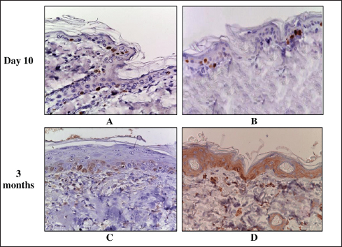 Fig. 5. Skin of the control and experimental groups after 10 days and 3 months. A–control group, immunohistochemical reaction with antibodies to Ki-67; B–after 8 Gy single electron irradiation, immunohistochemical reaction with antibodies to Caspase-3; C–after 40 Gy single electron irradiation, immunohistochemical reaction with antibodies to Ki-67; D–after 40 Gy single electron irradiation, immunohistochemical reaction with antibodies to Caspase-3. Nuclei were stained with hematoxylin. Magn. ×400. Table 7. Scoring of the expression of types I and III collagen fibers in the skin of the control and experimental groups.