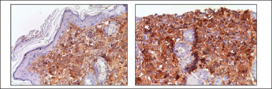 Fig. 6. Skin fragments 3 months after a 40 Gy single (left) and fractional (right) local electron irradiation. Immunohistochemical reaction with antibodies to Collagen I; nuclear staining with hematoxylin. Magn. ×400. Three months after 8 Gy of local electron irradiation, we observed a return of the immunoreactivity levels of pro-inflammatory and anti-inflammatory cytokines to the control values. At the same time, after 40 Gy irradiation, we observed a slight increase in the expression of pro-inflammatory cytokines and IL-4. Three months after fractional electron irradiation, elevated immunoreactivity levels of IL-1, IL-6 (including in single fibroblast cells), and IL-4 remained. In addition, this was accompanied by a slight increase in the level of IL-10 immunoreactivity compared to the control (Fig. 7). DiscussionThis study is devoted to the immunohistochemical evaluation of impaired keratinocyte proliferation, skin collagen synthesis, the degree of RIF, and the expression of inflammatory cytokines after 8 Gy and 40 Gy single local electron irradiation and 78 Gy fractional local electron irradiation. Radiation therapy is based on the concept that actively proliferating abnormal cells are more sensitive to ionizing radiation and cannot regenerate as efficiently as healthy ones. During a few hours there are formation of DNA double-strand breaks (direct effect), reactive oxygen species (ROS), and other radicals that damage DNA and other cellular components (for example, cell membranes, proteins, and lipids; indirect effect) (Jackson and Bartek, 2009; Mehta et al., 2010; Yoshimura et al., 2013). Cell death occurs by apoptosis or necrosis with the release of damage-associated molecular patterns: heat shock proteins, HMGB1, hyaluronan fragments, and so on (Lumniczky and Sáfrány, 2015; Brix et al., 2017). Some authors noted the death of keratinocytes in the epidermal basal layer after 3–5 Gy single γ-irradiation (Ward et al., 1990; Ran et al., 2004). However, in our study, an 8 Gy single local electron irradiation leads to weak epidermal pathomorphological changes. A slight decrease in the density of collagen fibers found after 8 Gy single local electron irradiation is also explained by the relatively low damaging ability of this dose (Soref and Fahl, 2015), at which microscopic analysis of the skin showed only a partial thickening of the basal layer and delamination of the stratum corneum of the epidermis. At the same time, the dermis remained intact, which explains the absence of differences in collagen metabolism in this group compared to the control, since most of the collagen fibers and fibroblasts that produce them are located mainly in the papillary dermis (Blair et al., 2020).