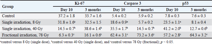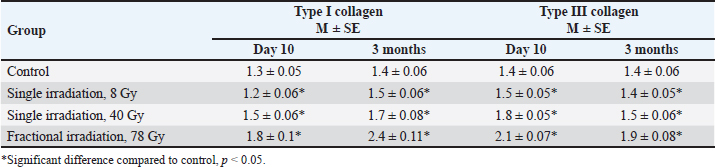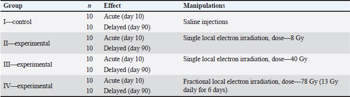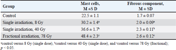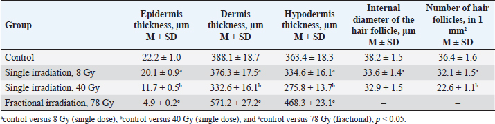 Animals were removed from the experiment by ketamine+xylazine high concentrations in accordance with the design of the experiment. The Radiation Therapy Oncology Group (RTOG) acute radiation morbidity scoring criteria and RTOG/European Organisation for Research and Treatment of Cancer (EORTC) late radiation morbidity scoring scheme were used to assess early (acute) and delayed side effects of radiotherapy. Histological examinationSkin fragments after fixation in a buffered formalin solution were prepared according to a standard protocol and stained with hematoxylin and eosin. The obtained histological micropreparations were analyzed by three blinded pathologists in 10 fields of view of a light microscope. Histochemical examinationOne slide from each batch was stained with Masson, safranin, and picrosirius red. For the specific detection of collagen fibers and assessment of the degree of fibrosis in the dermis, the histochemical staining method according to Masson (Weigert's hematoxylin, acid fuchsin, phosphomolybdic acid, and aniline blue) was used. To specifically identify collagen fibers and assess the degree of fibrosis in the dermis, a histochemical staining method with picrosirius red (Mayer's hematoxylin, Sirius red F3BA, picric acid) was used. For the specific detection of cytoplasmic granules of mast cells in the dermis, a histochemical method of staining with Safranin-O, which binds to acidic proteoglycans and belongs to the group of basic stains, was used. Morphometric analysis of micropreparations stained with hematoxylin and eosin was carried out in 10 randomly selected fields of view of a light microscope at ×400 magnification. Then, we calculated the thickness of the epidermis, dermis, and hypodermis, the inner diameter of the hair follicle, and counting the number of hair follicles using a video microscopy system (Leica DM2000 microscope) and Leica Application Suite, Version 4.9.0 software. Computer morphometry was performed using the ImageJ computer image analysis system. The number of collagen fibers in the sections was measured using an image analysis computer program (BMI plus software, BumMi Universe Co.) and expressed as a percentage of the area occupied by collagen fibers in the upper dermis. The number of mast cells after staining with safranin was determined by computer morphometry in 10 fields of view with a total area of 1.6 mm2, then the quantitative density of mast cells per 1 mm2 was calculated by the formula: