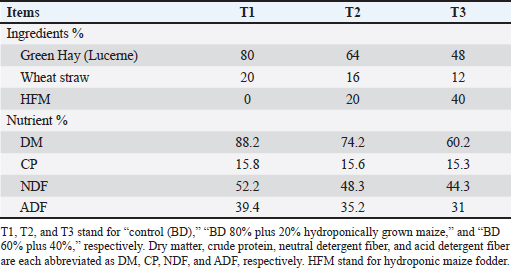 DiscussionThe DM% of HFM was 18.19%, which agrees with the results reported by Naik et al. (2014), who found that calves fed hydroponically grown maize fodder saw a large rise in DCP values and a non-significant increase in TDN values. Additionally, Verma et al. (2015) found that Haryana calves fed hydroponically grown barley fodder experienced a significant (p < 0.05) increase in DCP% and a highly significant (p < 0.01) TDN%. Further, Dadhich et al. (2019) observed that hydroponic maize fodder had a significant (p < 0.01) impact on the percentages of DCP% and TDN% in Rathi calves. Also, Naik et al. (2014) found that partial replacing hydroponic maize fodder with maize grain of concentrate mixture enhanced dry matter intake per 100 kg body weight. Farghaly et al. (2019) indicated that hydroponic barley fed to sheep improved dry matter intake. Additionally, Dadhich et al. (2019) observed that hydroponic maize fodder had a significant (p < 0.01) impact on the percentages of DCP% and TDN% in Rathi calves. Helal (2015) noted that the TDN g kg−1 BW and DCP% enhanced significantly (p < 0.05) using sprouted barley grain in goats. Table 7. The effects of feeding hydroponically grown maize on the nutrient digestibility of buffalo calves.