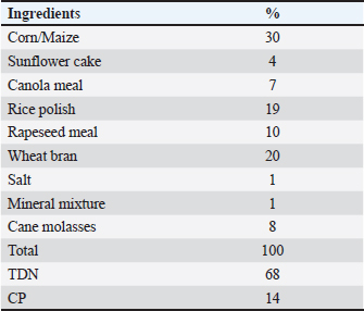 AbstractBackground: A hydroponic feeding system enables more effective utilization of the entire plant than typical grazing, which only consumes the plant's shoot. Aim: This study evaluated the effects of feeding maize hydroponic fodder on growth performance, nitrogen balance, nutrient digestibility, hematology, and blood metabolites of buffalo calves. Methods: Twelve water buffalo calves, weighing an average of 112 ± 1.18 kg and between 8 and 10 months old, were divided into three treatments, each with four calves. Each group received one of the treatment diets: T1: the basal diet (BD) at 100%; T2: the BD plus hydroponic feed meal (HFM) at 80%: 20%; and T3: the BD plus HFM at 60%: 40%. For 100 days, each animal was fed ad libitum; the first ten days were used for nutritional adaptation, and the final ten days were used for collection. In addition to their BD, each animal received 200 g/day of a normal concentrate mixture to meet their maintenance needs. The BD included Green Hay (Lucerne) 80% and Wheat straw 20%. Each animal's daily feed consumption was noted. Calves were weighed biweekly to track growth. Upon completion of the experiment, blood samples were obtained. Results: The amount of dry matter (DM) consumed by ruminants fed diets, including hydroponic fodder, was considerably higher (p < 0.05). Similar trends were seen in crude protein (CP), acid detergent fiber, and neutral detergent fiber intake. Ingesting of CP was highest in animals fed T3. Animals fed diets comprising BD 60% + HFM 40% had the highest levels of DM and CP digestibility. Animals fed the T3 diet (BD 60% + HFM 40%) showed the best feed conversion values (p ˂ 0.05). Blood metabolites like blood urea nitrogen, creatinine, and glucose showed non-significant variations in all experimental animals. In hematology, a similar trend was seen. Conclusion: Therefore, it can be said that supplementing the diet with more HFM helped growing buffalo calves gain weight, have a lower feed consumption ratio, and digest their food more efficiently. Keywords: Animals, Buffalo calves, Growth, Hydroponic fodder, Maize. IntroductionGreen fodder is a crucial part of livestock diet and greatly impacts how well they produce and reproduce and how healthy they are. Nevertheless, due to greater urbanization or manufacturing, there is now less pasture area accessible, which makes it challenging to provide the animals with the green feed they require. Investigating all available feed supplies for animal production is necessary because a lack of high-quality green fodder harms livestock health (Safwat, 2014). The hydroponic fodder sector has received significant global attention recently, which has rekindled interest among academics and cattle owners alike (Naik, 2014; Prakash, 2017). Hydroponics is a technique for growing plants without soil using only a small amount of water. It is simpler to gather and hence requires less labor. Greek word hydroponics translates to “water working” (where “hydro” stands for “water” and “Ponic” for “working”). One kilogram of grain can be placed in a hydroponic system to produce 4–8 kg of fresh green sprouts without regard to the weather or the time of year. Within 8–9 days, the roots of hydroponic fodder can develop into a mat and reach a height of 25–28 cm (Diver, 2006; Rajkumar et al., 2018). Growing plants in water or a nutrient-rich solution without using soil, hydroponics fodder, sprouted grains, or sprouted fodder produced (Dung et al., 2010). According to Haddad et al. (2009), and Naik and Singh (2013), using hydroponics technology, up to 1,000 kg of maize feed may be generated daily from a 45–50 m2 space, which is equivalent to 25 acres of arable land used to create the same amount of feed using traditional methods. Beta-carotene, Vitamin A, E, and C, and Lysine, an important amino acid, are all abundant in hydroponically grown feed. According to Rajkumar et al. (2018), giving calves hydroponically grown maize fodder increases their dry matter (DM) intake, weight gain, and cost per kilogram of body weight gained. The growth performance and nutritional digestibility of goats fed hydroponically grown maize and barley fodder are improved (Kide et al., 2015; Dadhich et al., 2019). Using hydroponic technology, several feed crops can be cultivated in a hygienic setting free of pesticides, including insecticides, herbicides, fungicides, and synthetic growth promoters (Al-Hashmi, 2008; Al-Karaki and Al-Momani, 2011). Its high chlorophyll content boosts animal efficiency and eliminates antinutritional elements such as phytate (Naik et al., 2015; Girma and Gebremariam, 2018). Hydroponic fodder benefits animals’ health, mortality, conception rate, and abortion and is devoid of antibiotics, hormones, pesticides, and herbicides (Naik, 2014). The hydroponic fodder enhances the DM intake and lowers the cost per kg of body weight gain (Rajkumar et al., 2018). It also reduces heat stress and increases birth rates (Farghaly et al., 2019). According to Rani et al. (2019) and Jediya et al. (2021), found that hydroponically grown maize fodder may substitute up to 75% of the crude protein (CP) in a concentrated mixture and has a positive impact on the calves' growth and nutritional intake. Additionally, Sharma et al. (2023) demonstrated that hydroponics fodder might replace 75% of the CP in a concentrated mixture and positively impact Gir cows' ability to utilize nutrients. Also, according to Arif et al. (2023), feeding animals with hydroponic fodder could increase growth and productivity while bridging a feed supply gap in dry and semi-arid regions where most feeds are imported and resources for both land and water are limited. There are few reports on the nutritional value of hydroponic feed meal (HFM) for buffalo calves (Naik et al., 2015). Therefore, a trial regarding the evaluation of the growth performance of buffalo calves fed HFM was conducted. Materials and MethodsExperimental site