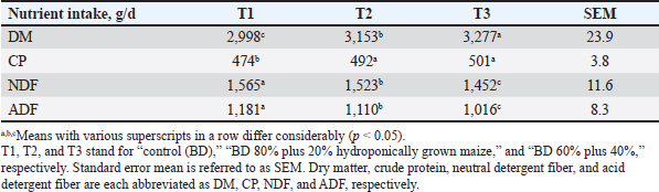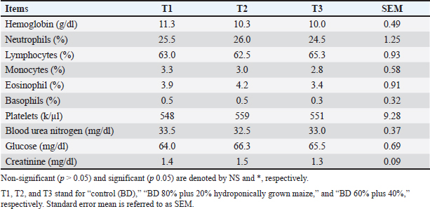 Nutrient digestibilityNutrient digestibility was determined by the total collection method. At the end of the trial (day 101), blood samples were gathered by puncturing the jugular vein. Blood was collected in vacutainer EDTA and heparin tubes. The hemoglobin content, differential leukocytic count, and platelets were measured in the EDTA blood samples (VetScan HM5, Abaxis, California, USA). An automated biochemical veterinary analyzer (VetScan VS2, Abaxis, California, USA) was used to assess the serum values of blood urea nitrogen, glucose, and creatinine in the heparin blood samples. Statistical analysisData were analyzed by the general linear model procedure of RCBD Steel et al. (1997). Using one-way ANOVA in SPSS (SPSS Inc., Chicago, IL), the Tukey test was used to differentiate between the means of different treatment groups. Ethical approvalAuthors adhere that procedures imposed on the animals were carried out according to the Directive 2010/63/EU of the European Parliament and of the Council of 22 September 2010 on protecting animals used for scientific purposes. Authors also adhere to the EU regulations on feed legislation, such as regulation EC No 767/2009 of the European Parliament Council of July 13, 2009. The Authors’ Institution Ethics Committee approved the study at the Department of Animal Sciences, College of Agriculture, University of Sargodha, Pakistan, for animal studies, and care was taken to minimize the number of animals used. ResultsThe DM content of HFM was 18.19%. The CP, NDF, and ADF content was 14.57%, 32.56% and 18.33% on a DM basis, respectively. The DM intake was greater (p < 0.05) in group-fed hydroponic fodder-containing diets. NDF, ADF and CP intake were also higher (p < 0.05) in HFM fed group. CP intake was greatest in animals fed T2 and T3 diets, i.e., treatment diet containing HFM (Table 4). The nutrient digestibility of buffalo calves fed a diet containing HFM was greater (p < 0.05) than that of calves fed a control diet. Weight gains were 490 (T1), 588 (T2), and 595 (T3) g/d (Table 5). Feed consumption ratio (FCR) in buffalo calves fed different diets was 6.33 (T1), 5.40 (T2), and 5.38 (T3); Table 5). The best FCR values (p < 0.05) were recorded in calves fed the T3 diet (BD 60% + HFM 40%). The animals fed a diet containing HFM evidenced an improved nitrogen balance than the control diet (Table 6). Nutrient digestibility was highest in animals fed a BD of 60% + HFM 40% (Table 7). The average NDF digestibility observed in the present study was 53.0%, 60.3%, and 60.8% in T1, T2, and T3, respectively. ADF digestibility was better in (p < 0.05) calves fed HFM than observed in the control diet (Table 7). Better nitrogen balance was observed in animals fed HFM-containing diets (p < 0.05). In all experimental animals, no statistical differences (p > 0.05) were observed regarding hematology and blood metabolites (p > 0.05; Table 8). Table 4. Nutritional intake by buffalo calves as a result of feeding them hydroponically grown corn fodder.