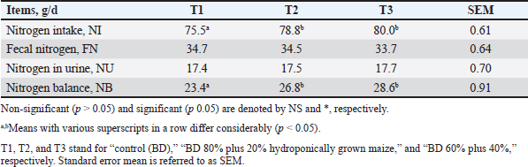 Table 6. Feeding effects of maize hydroponic fodder on nitrogen balance in buffalo calves.