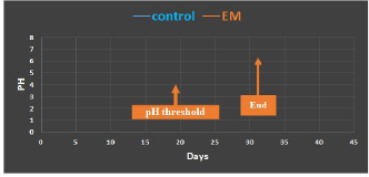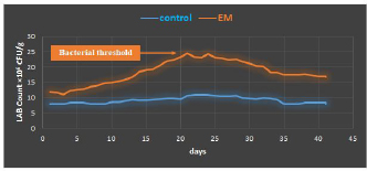 Fig. 4. The tracking rate of LAB count (CFU/g) in the normal and LAB-treated groups during the experimental period (×106). Figure 2 and Table 1 show that there is a significant difference in average temperatures between the two groups of all experimental periods, the temperature of the normal group ranged between 20°C ±2°C to 60°C ± 4°C, an average of 43.87°C ± 1.52°C and it took more than 60 days to complete the process, while the temperature in the LAB (EM) treated group ranged between 20°C ± 1.2°C to 70°C ± 2.4°C, an average of 51.95°C ± 1.54°C and it took 37 days to complete process and we got complete digestion of fish carcasses through 31 days. The results also showed significant differences in pH in the different composting phases in both groups, where the pH of the normal group ranged between 7.48 ± 0.05 to 6.5 ± 0.06, an average of 6.85 ± 0.88 peaked at day 26, whereas, the pH of the LAB (EM) treated group ranged from 6.93 ± 0.03 to 4.26 ± 0.01, an average of 5.76 ± 0.13 and its drop peak was on day 20, as shown in Figure 3 and Table 1. The results also revealed a significant and clear difference in the number of LAB count between the two experimental groups, as it ranged from 8.1 ± 0.15 × 106 CFU/g to 11 ± 2.97 × 106 CFU/g at average of 9.21 ± 1.85 × 106 CFU/g for the normal group, and 11.2 ± 1.16 ×106 CFU/g to 24.3 ± 0.78 × 106 CFU/g at average of 18.18 ± 1.64 × 106 CFU/g for the LAB (EM) treated group. As described in Figure 4 and Table 1. In addition, very clear differences were recorded during the experiment for both groups in terms of the time taken for the different phases of the composting process and threshold limits for each of the temperature, pH, and numbers of LAB, as shown in Table 2. DiscussionFrom an ecological point of view, composting is a dynamic process due to the combined activity of a wide range of microorganisms, including bacteria, actinomycosis, and fungi, which are linked to successive environmental conditions through a symbiotic relationship with each other (Moreno et al., 2013). The composting process is determined by the various physical and chemical factors that are related to each other and that alternate with different environmental conditions, including the availability of nutrients, temperature, amount of oxygen, pH, particle size, humidity, and so on; therefore, it is necessary to try to modify these data and control it well, so that the microorganisms can find the best conditions to perform their biological activities in the best way, where LAB play a major role in all stages of the composting process through events related to the biotransformation of organic components, being a more effective bacterium due to its versatility in metabolism; therefore, understanding the role played by microorganisms will have an impact on the composting process and improve its efficiency (Brown et al., 2008; Ayilara et al., 2020). Table 2. Comparison between three phases in duration/day and threshold point of temperature, pH, and LAB count (CFU/g) (Mean ± SE) in normal and LAB-treated groups during the experimental period.