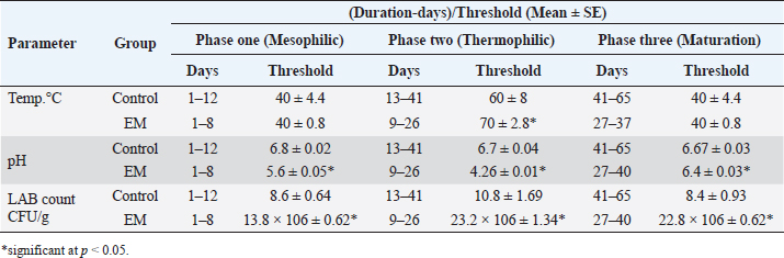 Mahmud et al. (2015). indicated that to achieve the condition of the composting process, the temperature must rise in the first phase, specifically during the first days, to reach 40°C to 45°C to reach their threshold, and then start the second phase of the composting process, which is the high-temperature stage where the temperature reaches 60°C, which is very important in composting success. This was evident in the results of our study by reaching EM groups to the second phase in less time compared to the normal composting groups. The LAB showed a higher growth pattern than the patterns naturally found in the carcasses of dead fish, where the growth was according to the need for nutrients and their ability to use nitrogen and other nutrients resulting from protein decomposition. nutrients, heat, and deodorization of gases resulting from the composting process, thus preventing the arrival of insects, birds, and disease vectors over dead bodies, and thus reducing the spread of diseases. This matches what the researchers reported (Lopez-González et al., 2015; Mahmud et al., 2015; Villar et al., 2016). The degrading enzymes produced by the LAB work to break down keratin and other proteins in the scales and skin, which yield carbon, sulfur, and energy, which are used by the bacteria for growth and sustainability (Burtt, 1999). LAB patterns are present everywhere and they can grow on natural media without any special needs, this feature is used to break down organic matter in large quantities, moreover, LABs are thermophilic microorganisms that prefer high temperatures, this property is also used to control the process of rapid and efficient breakdown of scales, skin, and tissues, as confirmed by researchers (DeRouchey et al., 2005; Taher and Tabbaa, 2012). In addition to the enzymes that break down complex molecules such as keratin, which are among the many enzymes that are widely used in the chemical, medical, and animal feed industries (Ichida et al., 2001). The addition of LAB (EM) played a role in increasing the numbers of LAB, which was reflected in a faster digestion and disintegration process with higher temperatures compared to normal composting groups. The temperature in the group that was treated with the LAB reached more than 70°C, which is an ideal and preferred temperature because it leads to accelerates the process of decomposition and disintegration of tissues and the exclusion of other bacterial species that cause decay and killing larvae of flies and other insects that transmit diseases, and this what Yoon et al. (2019) explained. According to researchers (Tabbaa and Taher, 2009; Taher and Tabbaa, 2012; Mahmud et al., 2015), the pH is very important for the microorganisms in the composting processes in several directions through helping to accelerate the digestion of organic materials and the production of organic acids in the early stages of composting, that lead to encourage the growth of fungi that destroy the remaining complex materials that bacteria cannot break down as they grow and spread with many cells and hairs and attack the dry and acidic organic residues and break down lignin and cellulose. This was evident in the results of the current study by decreasing the pH value of LAB composting, which was like a slow cooking process, compared to the normal composting groups. This improvement in the composting process is due to the increase in the number of synergistic microorganisms formed in the natural bio-product LAB, which was evident through the ratio of LAB number, which constitutes 80% of the components of the LAB, and had the greatest effect on the course of this process in terms of time, speed of disintegration, decomposition, and maturation. Therefore, adding LAB-producing enzymes that decompose organic matter is considered a ways to dispose of organic matter and animal carcasses, as the results encourage belief in using LAB to treat other types of waste to preserve the environment from various pollution problems. ConclusionWe concluded that the using of LAB(EM) in the composted materials from dead fish carcasses led to a quick and efficient composting process in terms of temperature, pH, LAB count, total disintegration speed, and the ability of biosafety to eliminate pathogens. Because of their significant impact on the composting period and reducing the composting time. The pH of composted materials, where the composting process changed as a result of acid digestion of dead fish, thus disintegration and digestion faster. In our experiment, we obtained a complete digestion and dissolution of the dead fish in 31 days. AcknowledgmentThe researchers extend their deep thanks and great gratitude to the Deanship of the College of Education for Girls, Tikrit University, and to the Deanship of the College of Veterinary Medicine, University of Mosul, for the unlimited support to complete this work. Conflict of interestThe authors declare that there is no conflict of interest. FundingSelf-funding. Authors contributionsThe experiment was designed and the manuscript was written by Abed Erdeni and Dhyaa Jwher. Muntaha Hassan and Dhamyaa Al-Doory participated in the work by monitoring the experiment and analyzing the data. Data availabilityAll data supporting the findings of this study are available within the manuscript. ReferenceAbabneh, M., Hananeh, W. and Alzghoul, M. 2020. Mass mortality associated with koi herpesvirus in common carp in Iraq. Heliyon 6(8), 4827–4830. Allen, F.H. and Mark, J.E. 2003. Composting for mortality disposal on hog farms, Virginia tech tidewater. Agricultural Research and Extension Center, Virginia State, USA, pp: 414–420. Alosairi, Y., Al-Ragum, A. and Al-Houti, D. 2021. Environmental mechanisms associated with fish kill in a semi-enclosed water body: an integrated numerical modeling approach. Ecotoxicol. Environ. Saf. 217, 112238. Ayilara, M., Olanrewaju, O., Babalola, O. and Odeyemi, O. 2020. Waste management through composting: c