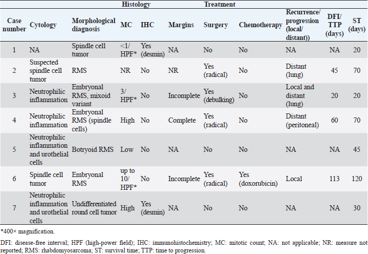 An obstructive urethral mass did not allow endoscopic examination of the urinary bladder in one case (number 6). Both dogs with indirect signs of ureteral occlusion showed bilateral ureteral papillae involvement at endoscopic examination. Four of six endoscopically evaluable tumors appeared as grape-like shaped masses (Fig. 1) and two as solid, and sessile masses. Both latter were located dorsally on the bladder body. The grape-like shape was associated with a friable consistency, while solid and sessile masses resulted in firmness. The cytological examination was performed in six cases but failed to diagnose RMS in four cases. In two cases an atypical spindle cell population was observed, suggesting mesenchymal origin. Histological diagnosis of RMS was reported in five of seven cases. Two cases were classified as round cell tumors and not further classified as spindle cell tumors at morphological examination and as RMS after immunohistochemistry (desmin +). Mitotic count was reported in six of seven cases and resulted low in two cases and a high in four (Table 2). One dog received radical surgery and adjuvant doxorubicin, two dogs received radical surgery, one received debulking surgery and three dogs received palliative medications only (Table 2). Overall median ST was 45 days (range 20–120). The present study confirms that ubRMS occurs rarely in dogs, frequently in young dogs. Moreover, the dogs included in the present study died soon after diagnosis from causes related to tumor progression, confirming that ubRMS is an aggressive tumor typically associated with a poor prognosis. In the authors’ opinion, the present study raised some interesting points of discussion including tumor appearance and treatment. DiscussionUbRMSs are usually described as masses located in the trigone and with friable consistency and grape-like appearance, from which the term botryoid (Cooper and Valentine, 2017). Differently, in the present study ubRMSs were in the dorsal wall of the urinary bladder in two cases (Case no. 2 and 4) and they had firm consistency. The location of the tumor allowed for a partial cystectomy with curative intent; however, both dogs died shortly after due to metastases. The main limit of this study is that no immunohistochemistry confirmed the skeletal muscle origin in most cases but there are some reasons to suppose that histological diagnosis of RMS was correct for dogs included in this study. Non-RMS urinary bladder sarcomas in dogs are described rarely including several histological subtypes: fibrosarcoma, osteosarcoma, hemangiosarcoma, leiomyosarcoma, histiocytic sarcoma, lymphangiosarcoma (Seely et al., 1978; Liptak et al., 2004; Olausson et al., 2005; Amores-Fuster et al., 2011; Woldemeskel, 2017; Delaune et al., 2018; Michishita et al., 2020; Townsend et al., 2020; Shigihara et al., 2021). In comparison to ubRMS, other histological forms of bladder sarcomas tend to occur in adult or older dogs. However, an aggressive and metastatic fibrosarcoma in a 14-month-old dog has been reported (Olausson et al., 2005). The tumor was described as a multilobulated firm mass involving the bladder neck, microscopically classified as fibrosarcoma because of the fibroblastic-like cell appearance with high mitotic activity and vimentin expression. However, no further antibodies were used to define the tumor histotype. In the current study, all cases of ubRMS occurred in dogs younger than 3 years. All five morphological diagnoses of ubRMS included in the present study showed atypical spindle cells frequently with high mitotic activity. In the authors’ opinion, a misclassification of ubRMS is unlikely even with the lack of immunohistochemistry investigation due to the lack of consistent literature on bladder sarcomas other than RMS in young dogs.
