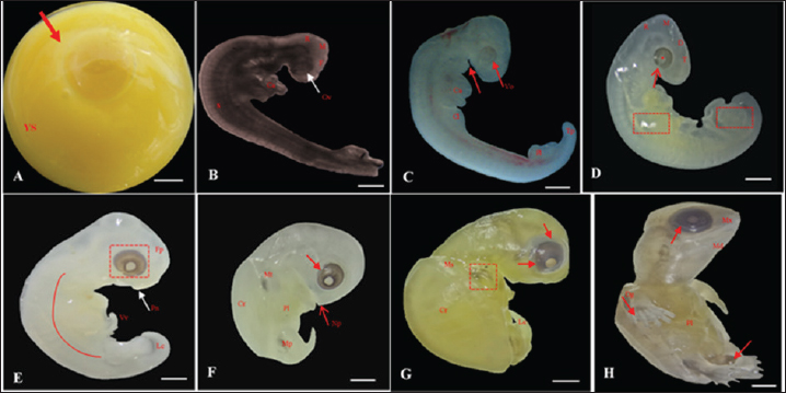 Fig. 2. Embryonic development of K. scorpioides. Side view: A—stage I: yolk sac (YS), blastodisc (arrow); B—stage II: cerebral vesicles—forebrain (F), midbrain (M), rhombencephalon (R), optic vesicle (Ov), somites (S), cardiac area (Ca). C—stage III: pharyngeal arch (arrow), cardiac area (Ca), chest limb bud (Cl), pelvic limb bud (Pl), tail process (Tp). D—stage IV: cerebral vesicles—telencephalon (T), diencephalon (D), midbrain (M), rombencephalon (R), pupil (asterisk), choroidal fissure (arrow). E—stage V: placode (dashed rectangle), fronto-nasal process (Fp), longitudinal groove (red line), vitelline vein (Vv). F—stage VI: nasal pit (Np), carapace (Cr), pastron in formation (Pl), upper eyelid (arrow); G—stage VII: marginal shields (Ms), pigmentation of the base of the digits (dashed rectangle), upper and lower eyelid (arrow); H—stage VIII: maxilla (Mx), mandible (Md), interdigital membrane (arrow), urogenital papilla (up) (bar scale: 0.1 cm).