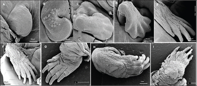 Fig. 4. Electromicrograph of the thoracic limbs of K. scorpioides embryos. A: stage III—beginning of bud formation. B: stage V—bulging of the shoots in the lateral regions. C: stage VI—emergence of digital cards. D: stage VII—member with a serrated edge. E: stage VIII—five digits separated by digital membranes. F: stage X—digits with folded skin and claws; G: stage XI—higher number of skin folds, scales, and thick and curved claws; H: stage XII—higher number of scales. I: stage XIV—Member fully formed.