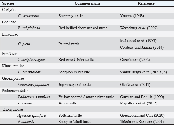 Open Vet. J.. 2024; 14(4): 962-972 Open Veterinary Journal, (2024), Vol. 14(4): 962–972 Original Research Embryonic development of the scorpion mud turtle (Kinosternon scorpioides) bred in captivityLianne Polliane Fernandes Araujo1, Diego Carvalho Viana2, Ligia Tchaika3, Juliana Maria Alves Caldas4,5, Antônio Chaves Assis Neto6, Maria Angélica Miglino6 and Alana Lislea de Sousa4,5*1Biotechnology (BIONORTE), São Luís, Brazil 2Center for Advanced Morphophiological Studies (NEMO), Centre of Agrarian Sciences, State University of the Tocantina Region of Maranhão (UEMASUL), Imperatriz, Brazil 3Programa de Pós-Graduação em Ecologia e conservação da biodiversidade, Centro de Educação, Ciências Exatas e Naturais, Universidade Estadual do Maranhão (UEMA), São Luís, Brazil 4Program in Animal Science, State University of Maranhão, University City Paulo VI, São Luís, Brazil 5Biotechnology, State University of Maranhão (UEMA), São Luís, Brazil 6Department of Surgery, School of Veterinary Medicine and Animal Science, University of São Paulo, São Paulo, Brazil *Corresponding Author: Alana Lislea de Sousa. Anatomy Group (Granato), Program in Animal Science, State University of Maranhão, University City Paulo VI, São Luís, Brazil. Email: alislea [at] hotmail.com Submitted: 26/09/2023 Accepted: 06/03/2024 Published: 30/04/2024 © 2024 Open Veterinary Journal