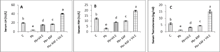 Fig. 2. Serum reproductive hormones in experimental rats. (A) LH, (B) FSH, and (C) Testosterone concentrations. Various letters were referred to statistical differences among groups at level (p < 0.05). (C): Control group, (Pb): Lead acetate group, (Pb + Vitamin E): Lead acetate + 100 mg/kg.b.w of vitamin E group, (Pb + KAF): Pb + 50 mg/kg.b.w. of kaempferol group, and (Pb + KAF + Vitamin E): Pb + 50 mg/kg.b.w. of kaempferol + 100 mg/kg.b.w. of vitamin E group. Table 3. Effects of kaempferol, vitamin E, and lead acetate on seminal function analysis in male rats.