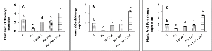 Fig. 3. Pituitary fold change expression in experimental rats. (A): Pituitary GnRHr fold change, (B): LHβ fold change, and (C): pituitary FSHβ fold change fold changes expression. Various letters were referred to statistical differences among groups at level (p < 0.05). (C): Control group, (Pb): Lead acetate group, (Pb + Vitamin E): Lead acetate + vitamin E group, (Pb + KAF): Pb + 50 mg/kg.b.w. of kaempferol group, and (Pb + KAF + Vitamin E): Pb + 50 mg/kg.b.w. of kaempferol + 100 mg/kg.b.w. of vitamin E group.