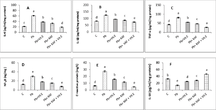 Fig. 5. Testicular markers of inflammation in experimental rats. (A) IL-6: interleukin-6, (B) IL-1β: interleukin-1β, (C) TNF-α: tumor necrosis factor-α, (D) NF-KB: nuclear factor kappa B, (E) C. reactive protein, (F) IL-10: interleukin-10. Various letters were referred to statistical differences among groups at level (p < 0.05). (C): Control group, (Pb): Lead acetate group, (Pb + Vitamin E): Lead acetate + 100 mg/kg.b.w of Vitamin E group, (Pb + KAF): Pb + 50 mg/kg.b.w. of kaempferol group, and (Pb + KAF + Vitamin E): Pb + 50 mg/kg.b.w. of kaempferol + 100 mg/kg.b.w. of vitamin E group. The levels of IL-1β, TNF-α, NF-kB, and C-reactive protein were significantly (p < 0.05) increased in Pb rats compared with that in all experimental groups. Interestingly, proinflammatory mediators were significantly (p < 0.05) declined in the Pb + KAF + vitamin E group compared to all experimental rats (Fig. 5B–E). The level of IL-10 lowered significantly (p < 0.05) in Pb and Pb + vitamin E groups compared to Pb + KAF + vitamin E, control, and Pb + KAF groups (Fig. 5F). It was elevated significantly (p < 0.05) in rats that received KAF and vitamin E after exposure to lead acetate compared to all experimental groups (Fig. 5F). Compared with Pb and Pb + vitamin E, the level of IL-10 was raised (p < 0.05) in the Pb + KAF group (Fig. 5F). Effects of kaempferol, vitamin E, and lead acetate on seminal function analysis in male ratsThe sperm count and percentage of sperm viability and motility were significantly (p < 0.05) declined, whereas the percentage of abnormal sperm was significantly (p < 0.05) raised in rats exposed to lead acetate (Pb group) compared to all experimental rats (Table 3). Interestingly, the administration of kaempferol at a dose of 50 mg/kg with vitamin E at a dose of 100 mg/kg after exposure to lead acetate can enhance and significantly increase (p < 0.05) the sperm viability, count, and motility, accompanied by significant (p < 0.05) lowering in the abnormal sperm in comparison with the control, Pb + KAF, Pb + vitamin E, and Pb group. In comparison with the Pb group and Pb + vitamin E, the percentages of motility and viability, as well as sperm count, were elevated significantly (p < 0.05) in rats administered KAF following exposure to Pb, whereas abnormal morphology of sperm significantly (p < 0.05) declined compared to Pb + vitamin E, control, and Pb groups (Table 3). The co-administration of lead acetate plus vitamin E can elevate sperm motility, count, and viability compared to Pb. Administered vitamin E with Pb can decrease (p < 0.05) abnormal spermatozoa compared to Pb and control rats (Table 3). Histopathological changesThe histological findings of lead acetate-treated male rats’ testes showed the irregular form of seminiferous tubules, marked cell loss, empty lumen, with edema and degeneration of Sertoli cells and seminiferous tubules with arrested spermatogenesis, compared to the control group that showed a typical architecture of the Sertoli cells, interstitial cells and seminiferous tubules (Fig. 6A and B).