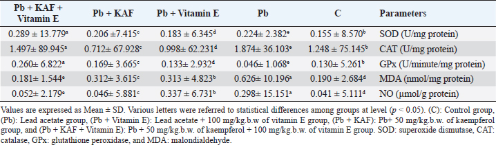 Table 2. Effects of kaempferol, vitamin E, and lead acetate on testicular oxidant stress and antioxidant status markers in male rats.