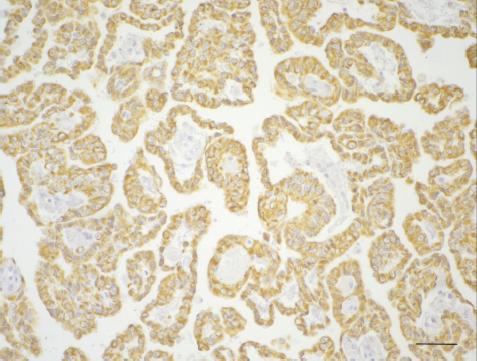 Fig. 4. Immunohistochemistry for pancytokeratin displaying diffuse immunoreactivity of polygonal cells revealing the epithelial origin of the neoplastic cells (3,3′-Diaminobenzidine stain; scale bar=100 µm). Finally, ELSTs presented with bone destruction and are epidural located, while CPP are mainly located within the brain and do not show bone invasion (Du et al., 2015). Clinically, ELSTs have very variable age of onset (4–71 years) and some studies suggest a slight female predisposition (Heffner, 1989; Schipper et al., 2006). A recent review confirmed previously published data indicating that in juvenile forms the disease appears to have a female predilection (2:1 ratio) and may be associated with more aggressive clinical behavior (Bausch et al., 2016; Talukdar et al., 2022). While the most frequently reported clinical symptoms in CPPs are related to the presence of increased intracranial pressure (headaches, vomiting, and nausea), symptoms related to vertigo, tinnitus, and hearing loss prevail in ELSTs (Du et al., 2015). In the two canine reports, there was no evidence of invasion of the cranial cavity, both cases were successfully treated surgically (total ear canal ablation and bullae osteotomy), and no relapses were reported at 9 and 12 months after surgery (Barnes et al., 2017). Similar to canine cases, the histology of the neoplastic mass in this patient revealed a proliferation of ciliated epithelial cells arranged in anastomosing papillae and lining cystic cavities resembling endolymphatic sac epithelium. Cystic lacunae with a low amount of eosinophilic amorphous material as seen in human cases of ELST were detected in our cat but were not described in dogs. Likewise, immunohistochemistry for pancytokeratin identified neoplastic cells as of epithelial origin. The clinical, radiological, and histopathological findings presented by this patient are therefore compatible with the diagnosis of ELST. ConclusionELST is a very rare neoplasm in veterinary medicine; to the best of our knowledge, we reported this neoplasm for the first time in a feline patient. Tumor location, extension, and histomorphology appeared typical for ELST. Extension within the cranial cavity was associated with a worst prognosis in our cat compared to that reported in dogs in which only the tympanic bulla and ear canal were involved and surgical removal proved successful. Surgical treatment of human patients provides a good prognosis, and a recent work has proposed the use of radiotherapy in those cases in which it is not possible to obtain undamaged margins after surgical removal (Mendenhall et al., 2018). Further conclusions on prognosis and efficacy of different treatment modalities in veterinary medicine require a bigger cohort of patients and multicentric studies. AcknowledgmentThe authors declare that there are no conflicts of interest. Conflict of interestThe authors declare no potential conflicts of interest with respect to the research, authorship, and/or publication of this article. FundingThe authors did not receive any financial support for this research, authorship, and/or publication of this article. Consent to participateInformed consent (either verbal or written) was obtained from the owner or legal custodian of the animal described in this work for the procedures undertaken. For any animals or humans individually identifiable within this publication, informed consent (either verbal or written) for their use in the publication was obtained from the people involved. Authors contributionAll authors contributed to the study conception and design. The clinical case was followed up by Matteo Baccolini and Federica Tirrito. Magnetic resonance imaging was evaluated by Matteo Baccolini, Federica Tirrito, and Francesca Cozzi. Material preparation and data collection were performed by Rocco Lombardo. Macroscopical, histological, and immunohistochemical examination were performed by Marco Rosati. The first draft of the manuscript was written by Matteo Baccolini; final version was written by Matteo Baccolini; and Marco Rosati and all authors commented on previous versions of the manuscript. All authors read and approved the final version of the manuscript. ReferencesBarnes, K.J., Clear, V., Youmans, K. and Hardcastle, M.R. 2017. Endolymphatic sac tumor in two dogs. Vet. Pathol. 54(4), 683–685. Bausch, B., Wellner, U., Peyre, M., Boedeker, C.C., Hes, F.J., Anglani, M., de Campos, J.M., Kanno, H., Maher, E.R., Krauss, T., Sansó, G., Barontini, M., Letizia, C., Hader, C., Schiavi, F., Zanoletti, E., Suárez, C., Offergeld, C., Malinoc, A., Zschiedrich, S., Glasker, S., Bobin, S., Sterkers, O., Ba Huy, P.T., Giraud, S., Links, T., Eng, C., Opocher, G., Richard, S., Neumann, H.P. and International Endolymphatic Sac Tumor (ELST) Consortium. 2016. Characterization of endolymphatic sac tumors and von Hippel-Lindau disease in the International Endolymphatic Sac Tumor Registry. Head Neck. 38(Suppl. 1), E673–E679. Bell, D., Gidley, P., Levine, N. and Fuller, G.N. 2011. Endolymphatic sac tumor (aggressive papillary tumor of middle ear and temporal bone): sine qua non radiology-pathology and the University of Texas MD Anderson Cancer Center experience. Ann. Diagn. Pathol. 15(2), 117–123. Choo, D., Shotland, L., Mastroianni, M., Glenn, G., van Waes, C., Linehan, W.M. and Oldfield, E.H. 2004. Endolymphatic sac tumors in von Hippel-Lindau disease. J. Neurosurg. 100(3), 480–487. Du, J., Wang, J., Cui, Y., Zhang, C., Li, G., Fang, J., Yue, S. And Xu, L. 2015. Clinicopathologic study of endolymphatic sac tumor (ELST) and differential diagnosis of papillary tumors located at the cerebellopontine angle. Neuropathology. 35(5), 410–420. Hassard, A.D., Boudreau, S.F. and Cron, C.C. 1984. Adenoma of the endolymphatic sac. J. Otolaryngol. 13(4), 213–216. Heffner, D.K. 1989. Low-grade adenocarcinoma of probable endolymphatic sac origin a clinicopathologic study of 20 cases. Cancer 64(11), 2292–2302. Megerian, C.A