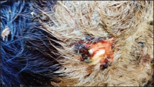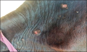 Fig. 3. Ulcerative lesion with the presence of yellowish exudate on the neck of the affected cow. Evaluation of serum inflammatory cytokines and anti-microbial parametersELISA-based serum levels of interferon-γ (IFN-γ) (Cusabio, China), interleukin-17 (IL-17) (Mybiosource, USA), interleukin-10 (IL-10) (Cusabio, China), beta-defensin, and lipocalin-2 (LCN-2) (Mybiosource, USA) were determined. Evaluation of hepatic and cardiac functions related to enzymesSerum activity of alanine aminotransferase (ALT), aspartate aminotransferase (AST), gamma-glutamyltransferase (GGT), creatine kinase MB (CK-MB), and lactate dehydrogenase (LDH) enzymes were evaluated using commercially available kits (Diamond Diagnostic, USA). Evaluation of renal-function-associated parametersConcentrations of urea and creatinine were detected in serum samples using commercial kits (Diamond Diagnostic, USA). Evaluation of oxidant/antioxidant biomarkersSerum concentrations of malondialdehyde (MDA) and reduced glutathione (GSH) with serum catalase (CAT) and superoxide dismutase (SOD) activities were determined in serum samples using commercially available kits (Bio-diagnostic, Egypt). Statistical analysisThe comparison between the means of the determined parameters was done using an independent t-test with the aid of the SPSS 16.0 software package for Windows. The values are present as mean ± standard error. Ethical approvalThis study was approved ethically by the institutional animal care and usage committee, at Alexandria University. ResultsChanges in some clinical parameters (body temperature, respiratory rate and pulse rate)Clinical examination of the animals revealed no statistically significant difference in body temperature, pulse rate, and respiratory rate between affected cows and the control group (Table 1). Serum inflammatory cytokines and anti-microbial parametersAs shown in Table 2, serum levels of IFN-γ and IL-17 recorded a significant decrease in animals suffering from edematous skin disease; this decrement was associated with a significant reduction in serum levels of beta-defensin and LCN-2 when compared to mean values of control animals, while the serum level of IL-10 was increased in affected cows as compared to healthy cows. Serum activity of hepatic and cardiac enzymesSerum activity of AST, ALT, GGT, CK-MB, and LDH enzymes recorded a significant increase in animals affected with an edematous skin disease as compared to healthy cows (Table 3). Serum level of urea and creatinineIn comparison with control healthy cows, serum concentration of urea and creatinine recorded a significant increment in animals affected with edematous skin disease (Table 3). Serum oxidant/antioxidant biomarkersThe present data in Table 4 showed that serum level the of MDA was increased significantly in cows with edematous skin disease, while serum activity of antioxidant enzymes (CAT and SOD) and serum GSH levels were decreased in the same group when compared to control healthy animals. Table 1. Mean values of some clinical parameters in healthy and diseased cows.