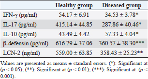 Table 2. Serum concentration of IFN-γ, IL-17, IL-10, β-defensin, and LCN-2 in healthy and diseased animals.