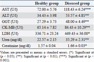 Table 3. Serum concentration of hepato-cardiac enzymes, urea, and creatinine in healthy and diseased animals.
