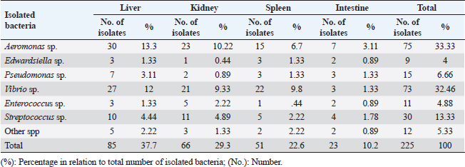 Edwardsiella tarda was further recognized biochemically as one of the Edwardsiella spp. All isolated Edwardsiella spp. emerged as greenish colonies with black centers over RS medium, which serves as a selective diagnostic media for E. tarda. The bacteria were determined to be motile, Gram-negative, short rod-shaped, and oxidase-negative organisms. In addition, Pseudomonas spp. colonization on TSA media displayed spindle form and diffusible dim yellow-green fluorescent pigments after 24 hours of incubation, whereas greenish colonies were noticed on the RS medium. On Pseudomonas-F-agar medium, however, it showed colonies that were 2–3 mm in diameter, yellowish green in color, and fluoresced after 48 hours of incubation. Pseudomona fluorescens was identified biochemically as Pseudomonas spp. All isolated Pseudomonas species were oxidase-positive, motile, Gram-negative, long, curved rods. However, additional biochemical identification was done for the Vibrio spp.; Vibrio harveyi, Vibrio alginolyticus, and Vibrio vulnificus. Bent rods, fermentative, Gram-negative, and positive for methyl red, catalase, and oxidase were all characteristics of the isolated Vibrio species. Vibrio vulnificus generated green colonies on TCBS media, whereas V. alginolyticus and V. harveyi generated yellow colonies. Colonies of Enterococcus sp. emerged on Streptococcus selective agar as extremely small, spherical, white colonies with complete borders or creamy rounded, big colonies (2–3 mm) with dew drop-like characteristics. An Enterococci displayed dark brown and black colonies on BBLTM EA. According to staining with Gram stain, Enterococcus faecalis is Gram-positive and is clustered in couples and occasionally short chains. Enterococcus faecalis is nonmotile bacteria and is negative for catalase, oxidase, and lysine decarboxylase. Biochemical testing identified S. iniae as one of the species of Streptococcus. It is a nonmotile, Gram-positive cocci that is typically organized in chains and is oxidase and catalase negative. Colonies typically have a greyish to pale color and shine over Edwards agar media. On blood agar, complete hemolysis was present in small, transparent, or pigmented white colonies up to 2 mm in diameter. Incidence of bacterial isolates in different organs and tissuesAccording to Table 2, 225 bacterial isolates were discovered in the liver, kidney, spleen, and intestine of naturally ill fish. The total amount of isolated bacteria found in various tissues (liver, kidney, spleen, and intestine) revealed six species; Aeromonas spp. (33.33%), Edwardsiella spp (4%), Pseudomonas spp (6.66%), Vibrio spp. (32.46%), Enterococcus spp. (4.88%), and Streptococcus spp. (13.33%). There were numerous instances of mixed infections in the same fish. Aeromonas spp. (75 isolates), Vibrio spp. (73 isolates), and Streptococcus spp. (30 isolates) were the three most common bacterial species. Prevalent bacterial isolates were chosen at random and tested by PCR. According to Table 3, the liver had the greatest percentage of isolated bacteria (37.7%), followed by the kidney (29.3%), spleen (22.6%), and the intestine (10.2%). In addition, the kidney, liver, and spleen yielded the bulk of the isolates of Aeromonas spp., Vibrio spp., and Streptococcus spp., while the gut had the lowest prevalence rates. Molecular identificationTo confirm the biochemically identified species, conventional PCR was used for molecular characterization. First, for the seven Aeromonas isolates chosen, Aeromonas spp. isolates identified utilizing the 16S rRNA region unique for A. hydrophila produced an amplified product of 625 bp size for five isolates, whereas two isolates were negative (Fig. 2). Examining seven isolates of Vibrio species for the genus gene (16s rRNA gene) allowed researchers to assess the genotypic characteristics of the species. As shown in Figure 3, five out of the seven isolates showed positive outcomes for the 16s rRNA gene, which has a molecular weight of 663 bp. Table 3. Prevalence and distribution of isolated bacteria from examined lesion samples.
