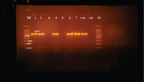 Fig. 3. Agarose gel electrophoresis of PCR products of 16S rRNA (663 bp) as species specific gene for confirmation of Vibro spp isolated from O. niloticus. Lane M: 100–1,000 bp. DNA Ladder. Lane (1,2,4,6&7): positive Vibro spp. Lane (3&5): negative Vibro spp. Lane +ve.: positive control for Vibro spp (at 663 bp.). Lane -ve .: Negative control or Vibro spp. Streptococcus isolates were identified using (Sin1, Sin2) specific genes for S. iniae, 16 Streptococcus isolates were tested and 15 were positive at 300 bp size, whereas 1 isolate was negative, as shown in Figure 4. Antimicrobial susceptibility assay of prevalent isolated bacteriaTo assess their susceptibility and the incidence of various types of antibiotic resistance among these isolates, the three common species isolates (A. hydrophila, Vibrio sp., and S. iniae) were tested against eight antimicrobial drugs in the current investigation (Table 4). The findings demonstrated that most A. hydrophila isolates were vulnerable to all antimicrobial substances, apart from AMX, against which they displayed resistance. While some strains of Vibrio and S. iniae were resistant to Oxytetracycline (O), AMX, CO-Trimethoprim-Sulfamethoxazole (COT), Erthyomycin (E), and S, certain strains of these bacteria were responsive to CIP, CN, and Chloramphenicol (C). All isolates showed high levels of resistance to AMX. However, for all isolated bacteria, CIP, CN, and C were the preferred medications.