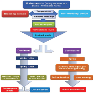 Experimental designA schematic representation of the experimental design is depicted in Figure 1. It is worth noting that rutting, which is the mating season for camels, occurs during the winter season, which is relatively short and crucial for achieving a higher conception rate. Trials were made by others to prolong the season by hormonal interference. Therefore, this experiment was applied in spring to investigate the possibility of prolonging the rutting season in natural ways on the three farms.
