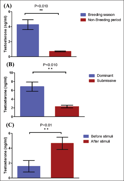 Fig. 4. Mean testosterone levels (ng/ml) during the breeding and nonbreeding season (A), means of testosterone levels (ng/ml) during breeding season (Submissive males are socially stressed males in presence of dominant male) (B), and means of testosterone levels (ng/ml) during the nonbreeding period before and after applying of an inductive external stimuli for their sexual drives (Hearing of couple sounds during copulation) (C). (*): Asterisk indicates a significant difference between the experimental groups (p < 0.05). Hormonal profile in winter rutter and spring rutterIn the winter season, values of testosterone in dominant males (winter rutter) were higher (p < 0.05) than in submissive males (Table 2). However, in May, the submissive male dominated the herd after beating the dominant (e.g., changing the dominance). Concurrently, testosterone levels in the submissive male in the spring rutter were higher (p < 0.05) than those in the winter rutter (Table 2). On the other hand, the cortisol concentrations in dominant males (winter rutter) were higher (p < 0.05) than those in submissive males (Table 3). Table 2. The means testosterone levels (ng/ml) with a change of dominance in male camels (n=10).