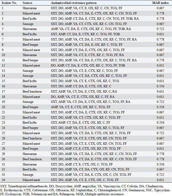 Antibiogram of B. cereus isolatesThirty-four B. cereus isolates were tested for in vitro antimicrobial susceptibility to 18 different antimicrobial agents. The results showed that all of the isolates were sensitive to ciprofloxacin and imipenem (100%, each) followed by clindamycin (26.47%), tobramycin (20.59%), vancomycin (20.59%), rifampicin (17.60%), and gentamicin (14.70%). However, all of the B. cereus isolates were resistant to the following drugs: ampicillin and colistin (100%, each), cefotaxime (94.12%), sulfamethoxazole-trimethoprim (91.20%), cephalothin and fosfomycin (91.18% each), chloramphenicol, erythromycin and tigecycline (88.23% each), ofloxacin (85.29%) and doxycycline (82.35%). It is interesting to note that every B. cereus isolate had an MDR (resistant to at least three antimicrobial classes) MAR index, ranging from 0.55 to 0.77, which was significantly higher than 0.3 (Table 3). Statistical analysis exposed a significant difference (p < 0.05) in the resistance of B. cereus isolates to tested antimicrobials. The frequency of B. cereus susceptibility to selected antimicrobial agents and their resistance pattern is shown in Table 4. Antimicrobial activity of ACV against B. cereusAs presented in Table 5, all ACV concentrations (100%, 80%, 60%, 40%, and 20%) exhibited marked inhibitory activities against B. cereus isolates while applying the agar well diffusion assay. The inhibitory zone diameters ranged from 44–48 mm/100%, 42–46 mm/80%, 38–44 mm/60%, 37–42 mm/40%, and 36–39 mm 20% concentrations. To determine precisely the antimicrobial properties of ACV, MICs, and MBCs were necessarily performed on 12 MDR B. cereus isolates. The MIC results showed that ACV exhibited strong antimicrobial activities against examined isolates with MIC ranging from 2 to 8 μg/ml. MIC50 and MIC90 of ACV against the examined isolates are 4 and 8 μg/ml, respectively. Some of the examined isolates showed MBC value at the same MIC value, considering the AVC as a bacteriocidal agent. Biofilm production by B. cereus isolatesThe qualitative recognition of biofilm on Congo red agar indicated that B. cereus biofilm producers (8/12; 66.67%) could alter transforming the media’s red hue into black because of sucrose consumption. On trypticase soya broth, 12 B. cereus isolates were cultured for quantitative detection of biofilm production. Three B. cereus isolates (25%) were strong biofilm producers, 3 (25%) were moderate, and 6 (50%) produced weak biofilm (Table 6). The results indicated that the quantitative detection of the biofilm is more accurate than the qualitative method using the Congo red agar. Table 3. Antibiogram of the B. cereus isolates recovered from meat and meat products.