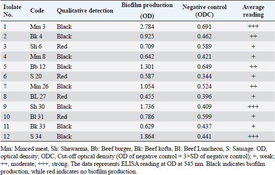 Transcriptional analysis of biofilm genes using RT-qPCRThe relative expression of the pleiotropic regulator (plcR), amyloid such as fiber (tasA) and signal peptidase (sipW) genes were evaluated in MDR strong biofilm-producing B. cereus isolates by RT-qPCR. The relative expressions (fold-change of the expression levels) of the characteristic genes in MDR and adherent isolates after the addition of ACV as antibiofilm agent were matched with those in the control MDR and adherent isolates without the exposure to ACV. The 16S rRNA housekeeping gene was used for RT-qPCR normalization (Fig. 1). The results revealed down-regulation of biofilm genes in comparison to those of the control; this was highly significant (***) for plcR and sipW genes ( p < 0.0001), while was significant (*) with tasA gene (p < 0.05) (Table 8). DiscussionBiofilms can be produced by the B. cereus group of the genus Bacillus in a variety of beverage and food industry settings. Concerned about a significant source of post-process and recurrent cross-contamination in prepared foods that could lead to food poisoning or product degradation, biofilms are a major source of concern for the food trade. Vasudevan et al. (2003) state that biofilms are frequently to blame for recurrent infections. According to Wijman et al. (2007), control over biofilm formation is therefore dependent on providing mechanistic insight into the behavior of B. cereus in biofilms. Therefore, the main objectives of this study were to isolate, identify, and test for antibacterial susceptibility B. cereus that was isolated from samples of meat and meat products. The recovered B. cereus isolates were then used to detect biofilm formation both qualitatively and quantitatively. Furthermore, evaluation of ACV for a better understanding of its effect on the gene expression that is responsible for biofilm formation and its regulator, using RT-qPCR to reduce the drawbacks of antibiotic resistance. The traditional identification methods were exposed as “presumptive B. cereus” because these methods could not distinguish B. cereus from other Bacillus group isolates (Vidic et al., 2020). Therefore, many laboratories’ stages should be performed to distinguish B. cereus from other Bacillus group species (Ramarao et al., 2020). The selective media and biochemical tests that these methods were designed to use are labor-intensive, time-consuming, and require specialized personnel (Zhu et al., 2016). However, molecular methods are more accurate for definitive identification. Herein, B. cereus was isolated from 34 out of 150 meat and meat product samples with an overall prevalence of 22.66%. Our results were consistent with those stated by Guven et al. (2006) (22.4%) and Amin and Tawfick (2021) (24%). On the other hand, higher percentages of B. cereus recovered from meat product samples were detected by Rather et al. (2011) (40%), Abd El Tawab et al. (2015) (38.33%), Yu et al. (2020) (35%), Tewari et al. (2015) (30.9%), Bashir et al. (2017) (29.33%), and Schlegelova et al. (2003) (28%). However, a lower prevalence rate was recorded by Konuma (1988) and Gharib et al. (2020) with percentages of 18.3% and 17.5%, respectively. Bacillus cereus may be present in raw meat products because of unsanitary conditions during meat delivery, processing, or transportation. According to Floristean et al. (2007), improper storage temperatures of raw meat could potentially encourage the growth of bacteria. The processing of minced meat may be the reason for the high frequency of B. cereus isolation from edible meat products such as luncheons or the addition of expired additives, which can induce vegetation of Bacillus spores under insufficient heat treatment (Shawish and Tarabees, 2017). Table 7. Antibiofilm activity of ACV against B. cereus isolates.