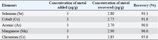 AbstractBackground: Camel meat tainted with heavy metals or trace elements may pose a health risk to consumers. Heavy metal contamination poses a severe danger due to both their toxicity and bioaccumulation in the food chain. Aim: To estimate the residual levels of heavy metals (Co, Cr, Mn, Se, and As) in muscle, liver, kidney, hair, and serum of three camel breeds (Magaheem, Maghateer, and Wadha) collected from Al-Omran abattoir, Al-Ahsa, Saudi Arabia. Methods: A total of 225 tissue samples (muscles, liver, kidney, serum, and hair) were taken and analyzed using an Atomic Absorption Spectrophotometer. Health risk assessment was assessed using the guidelines set by the US Environmental Protection Agency. Results: Camel breed significantly (p < 0.05) influences Co, Cr, Mn, and Se accumulation and distribution in organs and muscle; however, arsenic accumulation was not significantly affected (p < 0.05) by camel breeds. The highest values of Co, Cr, Se, and Mn in all examined samples were detected in the liver samples of Maghateer and Magaheem breeds. Furthermore, significant strong positive correlation between serum and liver cobalt, chromium, manganese, and arsenic. The estimated daily intake owing to camel meat consumption was less than the tolerated daily intake. Conclusion: Heavy metals were distributed among different breeds of camel. Trace elements (Pb and Cd) in meat and offal were below the international maximum permissible limit. The correlation between samples reflects the role of hair as a good tool for the identification of heavy metal pollution. Keywords: Camel carcass, Toxic metals, Risk assessment. IntroductionSaudi Arabia is the Middle East’s largest producer of camel meat, accounting for 62% of the total volume with annual per capita consumption of 3.10 kg (Index box, 2022). Camel meat is becoming increasingly popular due to its low fat, low cholesterol, and high polyunsaturated fatty acids (Kadim et al., 2008). Because of its comparable nutritional value, camel meat is a good alternative to other red meat (Kadim et al., 2022). The hazard of heavy metals in meat is of big concern for food safety and public health as well due to their toxic effect at very low concentrations (Santhi et al., 2008). When camels graze freely and drink water from contaminated sources, heavy metals may bio-accumulate and bio-magnify in their tissues and organs (Bala et al., 2018). Some heavy metals were proven to have carcinogenic, mutagenic, or teratogenic effects (Pitot and Dragon, 1995). In addition, toxic metals may compromise the metabolism and bioavailability of essential metals and decrease their body concentration (Lazarus, 2010; Matović et al., 2011). Trace elements, such as selenium, manganese, and cobalt, are essential metals where they play a significant role in biological systems. However, they can be very harmful and produce toxic effects if taken in excessive amounts (Mohammed et al., 2011). Chronic arsenic toxicity increases the risk of developing various cancers, such as skin, liver, lung, bladder, kidney, and colon cancer (Hu, 2002). Manganese toxicity can cause many pathological alterations in the CNS, reproductive and immune system dysfunction, damage to the testicles and pancreas, and hepatitis (Keen and Leach, 1987). Selenium plays a significant role in the health of both animals and humans. It is a crucial component of several enzymes that are required for the immune system as well as anti-carcinogenic activity (Navarro and Lopez, 2000). Monitoring the levels of trace elements and heavy metals in camel meat, as a human food, is of significant importance for both food safety and human health. Therefore, the goal of this research is to assess the levels of trace elements (selenium, manganese, and cobalt) and heavy metals (arsenic and chromium) in the blood, hair, and offal of three different camel breeds (Magaheem, Maghateer, and Wadha) in Al-Ahsa province, Saudi Arabia. In addition, human dietary intake of these metals and risk assessment associated with the consumption of such camel meat were estimated. Materials and MethodsSamples collectionA total of 225 tissue samples of muscles, liver, kidney, serum, and hair (n=45 for each) were taken from three local camel breeds directly after slaughter. Samples were obtained from Al-Omran central slaughterhouse, Al-Ahsa, Saudi Arabia. Al-Ahsa is classified as rural since it relies primarily on livestock production, but industrial activities are restricted. From October 2021 until January 2022, samples were gathered. The ages of the animals ranged from less than 5 to more than 10 years. All animals appeared to be in good health, active and disease-free. The samples were kept at a temperature of −20°C in falcon tubes until analysis. Sample preparation and extractionThe Shimadzu AA-7000 Atomic Absorption Spectrophotometer was used in conjunction with a graphite furnace atomic absorption spectrometry system (GFAAS) to assess the amounts of the trace elements (Se, Mn, Cr, Co, and As) (Table 1). In addition, hollow cathode lamps were used for the analysis. For Se, Mn, Cr, Co, and As analysis, were measured using the GFAAS system. The Shimadzu ASO6100 Automatic Sampler was used to inject the samples into the GFAAS (Waheed et al., 2022). After dilution and filtration with Whatman filter paper 1, the digested samples were analyzed using atomic absorption spectrophotometry according to the method mentioned by Meligy et al. (2019) and Hussein et al. (2022). Metal concentrations were calculated using standard curves for all metals studied. Quality assurance and controlMeasurement of IAEA142/TM from IAEA-certified reference materials (muscle homogenate) was used to ensure the accuracy of the assay (Vienna, Austria). The certified samples’ recovered concentrations were 5% of the certified values. Triplicates of each sample were evaluated. Estimated daily intake (EDI)As described by the Human Health Evaluation Manual (United States Environm