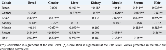 Fig. 1. Cobalt mean values (ppm) in liver, kidney, muscle, serum, and hair A. Effect of breed on cobalt concentrations (ppm). B. Effect of Gender on cobalt concentration (ppm). a,b Means with different superscript letters in the same sample type are significantly different (p ≤ 0.05). Table 2. Correlations between cobalt concentrations in organs and serum with breed and gender.