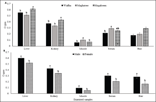 Fig. 2. Chromium mean values (ppm) in liver, kidney, muscle, serum, and hair A. Effect of breed on chromium concentrations (ppm). B. Effect of Gender on chromium concentration (ppm). a,b Means with different superscript letters in the same sample type are significantly different (p ≤ 0.05). Health risk assessmentThe presented results in Table 7 indicated that the EDI of all investigated metals from all breeds were below the tolerated daily intake (TDI) approved by FAO/WHO (2010). The noncarcinogenic hazard ratios (HRs) and hazard indices (HIs) were assessed in Table 8. DiscussionCobaltThe maximum Co concentration found in liver samples from different camel breeds was equivalent to the finding of Mahmud et al. (2011) and Asli et al. (2020) who examined muscle and liver in Iranian camels and found low concentrations in the liver and muscle of camels. Relatively higher levels of Co were reported in the liver compared with meat, liver, lung, heart, and kidney in previous studies as 1.10–14.22 mg kg−1 (Chafik et al., 2014) and 1.913–8.194 mg kg−1 (Al-Perkhdri, 2021). Camel breed influences Co accumulation and distribution in camel organs and muscle. Significant variations (p < 0.05) were found across breeds, which can be explained by each breed’s environment being in a distinct geographical location with varying concentrations of metals in soil, forages, and water. Faye et al. (2008) detected significantly higher cobalt levels in male than female camels collected from Emirates. The positive correlation attributed to Co can enter the body through the digestive tract from food or drink water or lungs after inhalation of Co dust.