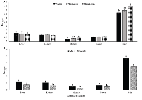 Fig. 3. Manganese mean values (ppm) in liver, kidney, muscle, serum, and hair A. Effect of breed on manganese concentrations (ppm). B. Effect of Gender on manganese concentration (ppm). a,b Means with different superscript letters in the same sample type are significantly different (p ≤ .0.05).