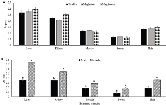 Fig. 5. Arsenic mean values (ppm) in liver, kidney, muscle, serum, and hair A. Effect of breed on arsenic concentrations (ppm). B. Effect of gender on arsenic concentration (ppm). a,b Means with different superscript letters in the same sample type are significantly different (p ≤ 0.05). Table 3. Correlations between chromium concentrations in organs and serum with breed and gender.