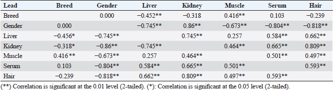 Table 6. Correlations between arsenic concentrations in organs and serum with breed and gender.