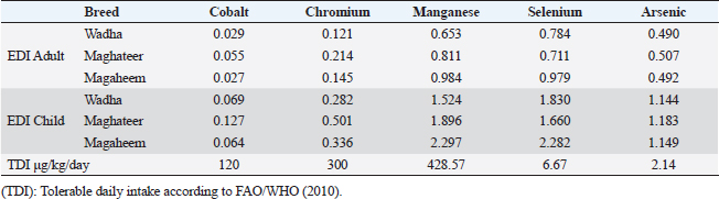ArsenicThe As values were not significantly varied between breeds but were highly significant with the effect of Gender. The obtained results were in comparable with the findings of El-Ghareeb et al. (2019). One probable explanation for the high As level in the studied samples is the use of feed additives rich in arsenic during intensive production, which is common in several regions worldwide (Hu et al., 2017). Inorganic arsenic is naturally present at high levels in the groundwater of a number of countries. Sources of arsenic exposure could include drinking water, crops irrigated with such water, and food produced with such water as well (Flanagan et al., 2012). The correlation coefficient between As concentrations in organs and serum with breed and gender in Table 5 revealed a strong positive correlation between gender and all examined samples. Meanwhile, breeds negatively correlated with liver, kidney, and hair. Health risk assessmentThe presented results in Table 7 indicated that the EDI of all investigated metals from all breeds were below the TDI approved by FAO/WHO. The EDI of Pb and Cd were lower than those reported from camel meat in Saudi Arabia (El-Ghareeb et al., 2019). The noncarcinogenic HRs and HIs were assessed in this study in Table 8. The HR from all examined metals below 1 meanwhile, HR(As) exceeding 1 for adults and children as 1.634 and 3.812, 1.689 and 3.942, and 1.641 and 3.828 from meat consumption of Wadha, Maghateer, Magaheem breeds, respectively. Since the toxicological profile primarily takes into account the inorganic chemical forms of arsenic, HR values for As bigger than one are not relevant for human wellness. This is because organic forms of arsenic are relatively nontoxic to humans (ATSDR, 2005). The HIs due to the consumption of the Maghateer breed are slightly higher than Wadha or Magaheem. On neglecting HR (As), HIs values were below 1, which proved no potential exposure to risk due to the consumption of camel meat from different breeds. The obtained values for HR and HIs were lower than those in Ghana (Bortey et al., 2015) and Saudi Arabia (El-Ghareeb et al., 2019). ConclusionIt can be concluded that heavy metals are distributed among camel samples of different breeds. Trace elements (Pb and Cd) in meat and offal were below the international maximum permissible limit. The correlation between samples reflects the role of hair as a good tool for the identification of heavy metal pollution. In addition, no potential health hazards among camel meat consumers in Saudi Arabia especially, adults. We need some future studies to differentiate between the percentages of organic and inorganic arsenic in camel meat and offal. AcknowledgmentThis work was supported through the Annual Funding track by the Deanship of Scientific Research, Vice Presidency for Graduate Studies and Scientific Research, King Faisal University, Saudi Arabia [Project No 4002]. Conflict of interestThe authors declare that there is no conflict of interest. FundingThe Annual Funding track by the Deanship of Scientific Research, Vice Presidency for Graduate Studies and Scientific Research, King Faisal University, Saudi Arabia [Project No. 4002]. Data availabilityAll data are provided in the manuscript. Any extra data needed can be provided by the corresponding author upon reasonable request. ReferencesAbdelrahman, M.M., Aljumaah, R.S. and Ayadi, M. 2013. Selenium and iodine status of two camel breeds (Camelus dromedaries) raised under semi intensive system in Saudi Arabia. Ital. J. Anim. Sci. 12(1), e14. Adam, A., Osama, S. and Muhammad, K.I. 2014. Nutrition and food consumption patterns in the Kingdom of Saudi Arabia. Pak. J. Nut. 134, 181–190. Al-Perkhdri, A.S.A. 2021 April. Study of the some heavy metals residues in the camel meat in different regions of Kirkuk governorate during the spring and summer seasons. IOP. Conf. Ser. Earth. Environ. Sci. 735(1), 012080. Al-Qarawi, A.A., Abbas, B., Haroun, E.M., Mahmoud, O.M. and Al-Hawas, A. 2001. Clinicopathological investigation of selenium responsive myopathy in young adult camels. J. Camel. Pract. Res. 8, 23–27. Asli, M., Azizzadeh, M., Moghaddamjafari, A. and Mohsenzadeh, M. 2020. Copper, iron, manganese, zinc, cobalt, arsenic, cadmium, chrome, and lead concentrations in liver and muscle in Iranian camel (Camelus dromedarius). Biol. Trace. Elem. Res. 194, 390–400. ATSDR. 2005. Agency for toxic substances and disease registry. Public health assessment guidance manual. Atlanta, Georgia: US Department of Health and Human Services. Available via https://www.atsdr.cdc.gov/pha-guidance/index.html (Accessed 07 October 2023). Bala, A., Junaidu, A.U., Salihu, M.D., Agaie, B.M., Saulawa, M.A., Musawa, A.I. and Ahmad, K.H. 2018. Determination of heavy metal residues in slaughtered camels at Sokoto and Gusau modern abattoirs, Nigeria. J. Health. Poll. 8(20), 181204. Bortey-Sam, N., Nakayama, S.M., Ikenaka, Y., Akoto, O., Baidoo, E., Yohannes, Y.B., Mizukawa, H. and Ishizuka, M. 2015. Human health risks from metals and metalloid via consumption of food animals near gold mines in Tarkwa, Ghana: estimation of the daily intakes and target hazard quotients (THQs). Ecotoxicol. Environ. Saf. 111, 160–167. Chafik, A., Essamadi, A., Eddoha, R., Bagri, A., Nasser, B. and Faye, B. 2014. Trace elements and heavy metals in organs of camels (Camelus dromedarius) slaughtered in Casablanca city, Morocco. J. Camel Pract. Res. 21(2), 145-152. China Standard. 2006. Specific maximum levels of contaminations in foods. Date: 8/14/2006 GAIN Report Number: CH6064 China, Peoples Republic of FAIRS 2006 Voluntary Report—public distribution. El-Ghareeb, W.R., Darwish, W.S. and Meligy, A.M.A. 2019. Metal contents in the edible tissues of camel and sheep: human dietary intake and risk assessment in Saudi Arabia. JJVR 67(1), 5–14. El-Khouly, A.A., Abbas, T.A. and Moustafa, T. 2001. Myocardial dystrophy in camel calves in the United Arab Emirates (field cases). Emir. J. Fo