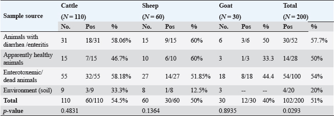 Fig. 1. Frequency of CP and their toxin types in cattle, sheep, and goat according to different variants. Table 2. Relation of CP in different animals with animal health conditions.