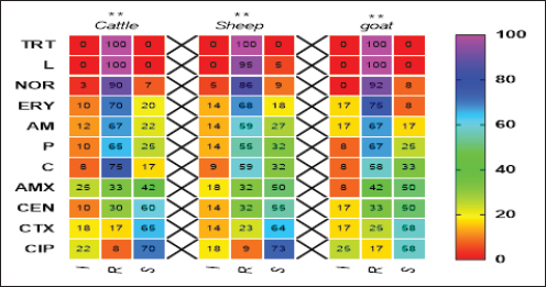 Pos: Positive samples for CP; No.: Number of examined samples. In vitro antimicrobial sensitivity results of the recovered CP isolatesAs shown in Figure 2, the estimated inhibition zones using the disc diffusion agar method classified the tested antibiotics against CP isolates into resistant, intermediate, or sensitive drugs. Accordingly, CP isolates in this study were found to be highly resistant against tetracycline (100%) and lincomycin (96.7%–100%). However, they were of moderate resistance rates against norfloxacin (90%–91.7%), erythromycin (70%–75%), ampicillin (63.3%–66.7%), penicillin (60%–66.7%), chloramphenicol (56.6%–58.8%) and amoxicillin-clavulanic acid (33.3%–41.7%) in all animal species as estimated in Table 3. In addition, ciprofloxacin, cefotaxime, and gentamycin drugs were the most sensitive drugs showing the lowest resistance rate that ranged (from 8.3% to 16.7%), (from 16.7% to 25%), and (from 26.7% to 33.3%) against CP isolates in all examined animals as estimated in Table 3.