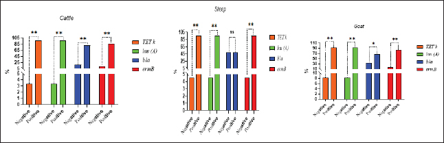 Fig. 3. Analysis of different toxin types of CP isolates and resistance determinants in different species; ns, nonsignificant; *p < 0.05; **p < 0.01.