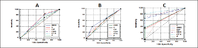Fig. 6. Relationships between different treatments of Moringa (Aqueous; A, Ethanol; B, and oil; C) and antibiotics (Penicillin (P), Chloramphenicol (C), Amoxicillin clavulanic acid (AMX), Gentamycin (CEN), Cefotaxime (CTX), and Ciprofloxacin (CIP) for CP isolates. DiscussionCP are serious pathogens intended for many animal histotoxic and enteric diseases (Fohler et al., 2016). The results of the current investigation revealed that CP was isolated in 51% of the total 200 examined samples from cattle, sheep, and goat species with the highest prevalence rate of CP strains from cattle species (54.5%) more than in sheep (50%) and goat (40%). Similarly, CP was isolated from 90/200 to 70/200 cattle and sheep samples were also documented in southern Iran (Hosseinzadeh et al., 2018). It was isolated also by 49% from the total of 174/355 rectal swabs of examined cattle, sheep, and goat animals. Moreover Kronfeld et al. (2022) detected CP pathogens in 14/27 (51.9%) in cow cases with a pathological puerperium. On the other hand, the higher incidence of CP 70.62% was recorded in 125/177 of the fecal samples of healthy, diarrheic, and morbid animals in Kashmir valley in India; of which, 110/125 (72.36%) were sheep isolates while 15 (60%) were goat isolates (Nazki et al., 2017). The discrimination in the incidence rate might be due to different geographic distribution or environmental climatic change, bad sanitary or hygienic conditions, lack of rapid diagnostic tests, or might be due to variant duration of the investigations studies (Moustafa et al., 2022). In Egypt, CP was reported in 51.5% where 103 out of a total of 200 examined lambs (100 lambs with diarrhea, 60 freshly dead, and 40 apparent healthy) showed the organisms (Moustafa et al., 2022). The recorded percentage (60%) in this study among diseased lambs came in line with that of 69.29% in a study of Kumar et al. (2014). In addition, in Pakistan, CP was identified in healthy and diseased sheep and goats in 46.1% (Mohiuddin et al., 2020). According to the health status of examined animals, the prevalence rate of CP in the current study was stated in Table 2 in the apparently healthy cattle (46.7%), sheep (60%), and goats (33.3%). This was nearly like the finding of Hamza et al. (2018) who found CP pathogens in the rectal swabs of apparently healthy sheep, buffaloes, and cattle in percentages of 65.45%, 55%, and 47.1%, respectively, at Cairo and Giza governorates in Egypt. CP is one of the heterogeneous groups of environmental bacteria that inhabitant in the animal surroundings, its environment, soil, and water since its existence might indicate the animal fecal contamination (Omar et al., 2018). The clostridia spores in soils and/or in apparently healthy animals could make sporadic disease episodes that could result in massive economic losses in animal production via the ingestion route and then production of their toxins (Gamboa et al., 2005; Diego et al., 2012). Great attention should be paid to the role of soil and or other surrounding factors like the irrigated water posing a risk especially when the water and soil contact food in the field. CP bacterium was isolated from the soil and irrigated water in 40% and 31.7% of samples, respectively (Hamza et al., 2018). This pathogen could affect all ages of animals (Nazki et al., 2017) but younger ages were severely affected (Jemal et al., 2016). Figure 1A cleared that the highest incidence of infection was at young ages in all examined species and this was consistent with Omar et al. (2018) who stated that newly born lambs with the age of <3 months were more susceptible to clostridial infections than older lambs (3–6 months and over 6 months of age). Regarding the seasonal variation and their effects on the incidence of CP infections in animals, the recent results in Figure 1B showed a higher incidence rate in winter (58.2%) followed by autumn season (56.7%). This corresponds to many studies in sheep and calves, respectively (Selim et al., 2017; Moustafa et al., 2022), in which, they confirmed that the winter season was of the highest incidence all over the year. This finding might be attributed to poor hygienic conditions, lower temperatures, and changes in the pasture during the winter season in comparison with other seasons (Omar et al., 2018). Enterotoxaemia is an acute, highly fatal disease that could produce severe losses in animal production. It affects all ages of animals (Nazki et al., 2017). In this study, the prevalence rate of CP was estimated in Figure 1C; from a total of 80 fecal and 54 intestinal and liver samples. A recent study in Saudi Arabia found that the prevalence of enterotoxemia was lowest in sheep (21.4%) compared with cattle, goats, and camels. These results were the same way with Alsaab et al. (2021) who detected it in 43% (40/93) from total examined 93 rectal swabs and intestinal content samples in diseased and enterotoxemic animals. Moreover, a high mortality rate in sheep and goats with enterotoxaemia in Egypt at El-Behera Governorate was referred to CPA organisms with its alpha toxin from 104 intestinal, liver, kidney, and spleen of the suspected cases. In addition, compatible results were reported by Nazki et al. (2017) and Omer et al. (2020). Application of PCR in toxin-genotyping of CP could provide a real basis for rapid diagnosis of this bacteria in animal farming (Ibrahim et al., 2017; Milanov et al., 2018). In this study, PCR confirmed the toxinotyping of the recovered CP in cattle, sheep, and goat strains. PCR displayed that type A was the most prevalent toxin in all examined animals followed by D and B as shown in Figure 1D. Many reports confirmed that finding of type A of CP was the highly detected type in cattle and sheep samples (Elsify et al., 2016; Hosseinzadeh et al., 2018; Hayati et al., 2020) . Moreover, Nazki et al. (2017) detected also that most of the sheep and goat isolates were type A (60.90% and 53.33%) followed by type D (39.09% and 46.66