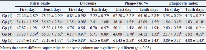 Table 4. Effect of toltrazuril and neem extract 4% on nitric oxide, lysosome, phagocytic %, and phagocytic index of infected broilers with E. tenella.