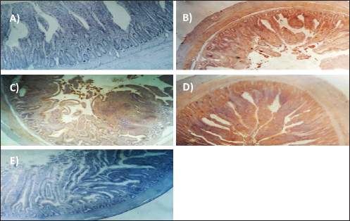 Fig. 1. Peroxidase-stained intestine of A) healthy broilers showing -ve expression of CD4. B) Infested broilers with E. tenella showed strong +ve expression of CD4. C) Broilers infested with E. tenella treated with toltrazuril showed moderate +ve expression of CD4. D) Infested broilers treated with neem showed almost strong +ve expression of CD4. E) Infested broilers treated with toltrazuril +half dose of neem showed -ve expression of CD4 (×400). The current study found that, as compared to the artificially infected and untreated group (+ve control), broilers with coccidiosis treated with toltrazuril or neem leaf extract, either alone or in combination, showed improvements in body weight, weight gain, and FCR. Toltrazuril’s anticoccidial action could be the cause of these improvements in body weight growth (Rachid et al., 2009). Our findings align with those published by El-Banna et al. (2005), who discovered that toltrazuril effectively treats coccidiosis in broilers and enhances their physical performance. The same outcomes were seen earlier by Sokoł et al. (2014), who reported that toltrazuril enhanced bodily functions and was beneficial in treating quail coccidiosis. In a similar vein, Onyiche et al. (2021) reported that neem extract improves body weight, weight increase, and FCR and is effective against E. tenella. When compared to healthy, noninfected broiler chickens, the current study found that E. tenella significantly increased the levels of WBC, lymphocytes, heterophil, eosinophil, basophil, and monocyte in broiler chickens. Our findings corroborated Coles’s (1997) observation that avian coccidiosis was associated with an increase in eosinophil count. Feldman et al. (2000) previously reported on these results, stating that eosinophilia was seen in birds with coccidiosis. This result was in good agreement with the findings by Razzaq et al. (2003), who found that quail with coccidiosis had a markedly higher WBC count than healthy, noninfected birds. The same findings were published by Seddik and El-Bealawy (2007), who claimed that enteritis brought on by coccidiosis in chicken causes a notable rise in WBCs. Furthermore, according to Chapman (2008), turkey with coccidiosis exhibits elevated WBC, heterophile, and lymphocyte levels. Increased concentrations of heterophils and eosinophils in response to parasite infestation are the cause of elevated WBCs (Wakenell, 2010). This result was consistent with results from Melkamu et al. (2018), who found that, in comparison to healthy, noninfested broilers, broilers infected with coccidiosis had elevated levels of WBCs and heterophil. When compared to infested nontreated broilers (+ve control), experimentally infested broilers treated with toltrazuril or neem leaf extract, either alone or in combination, showed significant decreases in WBCs, lymphocyte, heterophile, eosinophile, basophile, and monocyte. Comparing broilers infected with E. tenella treated with toltrazuril to those infected without treatment, Allam et al. (2008) reported similar outcomes, stating that there was a substantial drop in WBCs. The findings of the present study corroborated those of Sokoł et al. (2014), who found that toltrazuril effectively treated quail coccidiosis and increased the number of WBCs. Toltrazuril treatment for coccidiosis in broiler chickens resulted in a nonsignificant drop in WBCs, lymphocytes, heterophils, eosinophils, and basophils (Rehab, 2017). El-Ghoneimy and El-Shahawy (2017) noted the same alterations in leukograms in broilers with coccidiosis. Comparing broilers infested with E. tenella to those treated with toltrazuril or neem leaf suspension, either separately or in combination, showed improved total leukocyte counts. Similar findings were reported by Roy et al. (2019). Furthermore, in comparison to infected broilers that were not treated for coccidiosis, broilers treated with toltrazuril exhibited noticeably better WBCs, according to Shahira et al. (2021). The same results were observed by Onyiche et al. (2021) who mentioned that neem extract contains natural antioxidants in biological systems against parasites and ameliorative detrimental effects in total and differential leukocytic count. When compared to healthy, noninfected broilers, broilers infested with E. tenella showed substantial decreases in serum total protein, γ globulin, and albumin. There was also an insignificant decrease in α, β, γ, total globulin, and A/G ratio. Our results are confirmed with those reported by El-Banna et al. (2005) who mentioned that coccidiosis in broiler chicks generates a considerable decrease in total protein, γ globulin insignificant decrease in albumin, α, β, γ, globulin, and A/G ratio. Our findings are consistent with those of El-Dakhly et al. (2006), who found that, in comparison to healthy, noninfected broilers, coccidiosis causes a decrease in protein picture. The findings of Patra et al. (2010), who suggested that liver abnormalities and impaired nutritional absorption from the inflamed gut may be the cause of hypoproteinemia and hypoalbuminemia in broiler hens infected with E. tenella, corroborated our findings. This result was in good agreement with earlier research conducted by Abd El-Aziz et al. (2011), who reported that chicken cecal coccidiosis causes a considerable reduction in the protein picture. The same findings were published by Abd El-Maksoud et al. (2014), who showed that the serum total protein, albumen, globulin level, and A/G ratio of broilers infested with E. tenella decreased. When compared to a broiler infected with E. tenella that was not treated (+ ve control broiler), infested broilers treated with toltrazuril or neem leaves extract, either separately or in combination, showed nonsignificant increases in serum total protein along with insignificant increases in serum albumin, α, β, γ, total globulin, and A/G ratio. Toltrazuril treatment for coccidiosis in broiler hens results in nonsignificant redu