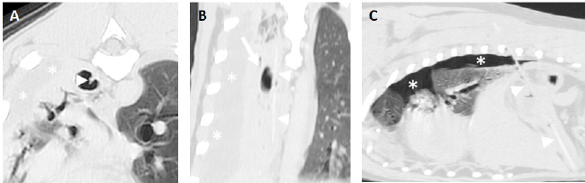 Fig. 2. A and B. Transverse and dorsal, post-contrast CT images (level −500 HU, width 1,400 HU) of the same patient showing a hyperattenuating (112 HU), 63 mm length × 1.3 mm width foreign body (arrowheads) lodged in the right caudal lung lobe and causing a small cavitary lesion (arrow). There is an asymmetric pleural effusion, more severe on the right side (asterisks). The right pulmonary lobes are decreased in volume with an almost generalized consolidation pattern, most likely secondary to atelectasis. C. Parasagittal post-contrast CT image (level −500 HU, width 1,400 HU) of a perforating wooden skewer foreign body from the stomach (arrowheads), perforating the pleural space and right caudal lung lobe which shows a focal increased attenuation and thickening of the visceral pleura. There is a mild volume of pneumothorax (asterisks). Note that the air within the pulmonary cavitary lesions or in the pleural space aids in the identification of these foreign bodies. In some of the cases presented herein, other imaging modalities were used before the CT examination. Only the ultrasound studies were able to identify the perforating foreign bodies. None of them could be detected on radiographs as they are usually radiolucent and, typically, secondary nonspecific changes are seen (Penninck and Mitchell, 2003; Hunt et al., 2004; Stander and Kirberger, 2011; Garcia-Pertierra et al., 2022). Surprisingly, in the two dogs in which a gastroscopy was performed, no perforating lesions were found despite one of them having several gastric foreign bodies identified. The experience of the operator, the presence of gastric contents, or appropriate endoscopic equipment may have played a role (Neiger and Stengel, 2021). All the wooden skewers were recognized by CT. The median attenuation was 79 HU which is slightly lower than the previously reported median attenuation of 111 HU for wooden foreign bodies (Lamb et al., 2017). This could be explained as attenuation values may vary depending on the foreign body characteristics before entering the body and absorption of fluids once ingested and migrated (Penninck and Mitchell, 2003; Lamb et al., 2017). As previously suggested (Nicholson et al., 2008; Lamb et al., 2017), the authors considered it more difficult to visualize the foreign bodies in post-contrast images as they were almost isoattenuating compared with the surrounding enhanced soft tissues. However, they were very well depicted when outlined by gas within the gastrointestinal tract or pleural space. The use of multiplanar reconstructions aided in their identification and trajectory, highlighting this tool in cases with this type of long and thin foreign objects. It has been previously speculated that the length and rigidity of this type of wooden foreign bodies prevent them from passing into the body or antrum of the stomach and cause them to perforate the wall of the fundus (Penninck and Mitchell, 2003). Accordingly, all the largest foreign bodies had one of the tips lodged in the stomach and longer perforating trajectories that extended either into the thorax or paravertebral/costal soft tissues depending on the orientation. The remaining and shorter foreign bodies were more prone to advance into distal portions of the gastrointestinal tract causing perforating lesions in the jejunum (Fig. 1). However, one of these smaller wooden foreign bodies was within a right caudal lung lobe and a clear communication with the abdomen was not seen on CT images. An origin from the digestive system, either the oesophagus or the stomach, was suspected as there was no previous history or secondary lesions supporting a theoretical inhalation or penetrating trajectory from the thoracic wall. Interestingly, this patient had a previous history of resolved abdominal effusion which could potentially be explained if a migrating pathway from the gastrointestinal tract was followed by the fragmented wooden skewer. The most common secondary finding was fat stranding with a reticular pattern adjacent to the perforation site. This is described as an abnormally increased attenuation in fat due to edema and engorgement of lymphatics (Thornton et al., 2011), found to be helpful for the localization of the underlying cause in dogs and cats (Jang et al., 2022). Despite in our cases, it was considered minimal in most of them, the presence of fat stranding adjacent to the stomach or a small bowel loop may aid in the identification of this type of perforating foreign body. In a previous study of gastrointestinal perforation in dogs and cats evaluated by radiography and ultrasonography the second most common finding was peritoneal effusion while free gas in the abdominal cavity was detected in 47% of the cases (Boysen et al., 2003). Unexpectedly, only two of our dogs showed pneumoperitoneum and one peritoneal effusion, both findings were considered mild. The presence of free gas in the peritoneum depends on several factors (Ranschaert and Rigauts, 1993; Boysen et al., 2003). We hypothesize that the small number of cases with pneumoperitoneum and abdominal effusion is related to the minor size of the perforation which may be sealed by the surrounding omentum and inflammatory changes. The chronicity in some of these patients may have also played a role. A bias may have been introduced as the entire abdominal cavity was not included in all patients. Pleural effusion was the most common finding in dogs with involvement of the thoracic cavity. The median attenuation of these fluids (27 HU) was compatible with exudate, modified transudate, or hemorrhage (Woods et al., 2018) and, in agreement with the cytologic or positive culture, finally classified as septic exudate. Pannus, defined as sheet- or mass-like tissue that replaces fibrin peel in dogs with inflammatory or reactive pleural effusion (Vansteenkiste et al., 2014), and thickening of the parietal pleural were identified less frequently and considered nonspecific features in associa