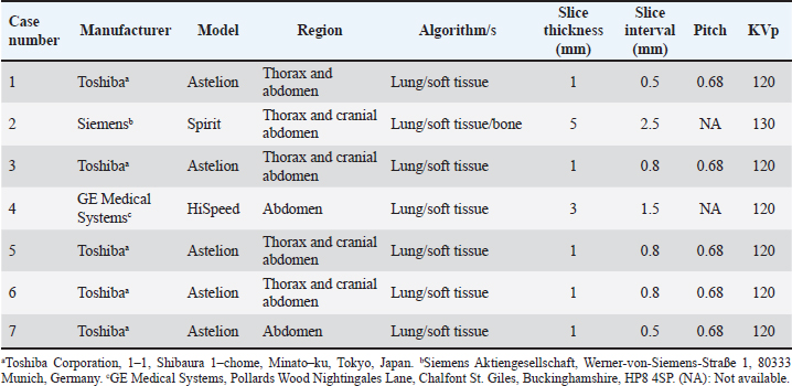 AbstractBackground: Perforating foreign bodies from the gastrointestinal tract, such as wooden skewers, are reported in the small animal literature producing inflammatory/infectious lesions in the thorax, abdomen, and musculoskeletal system, which can be life-threatening in some instances. Several imaging modalities have been used, and advanced imaging techniques have shown a great advantage in its diagnosis and pre-surgical planning. Aim: The objective of this study is to describe the computed tomographic findings in a group of seven medium to large breed dogs with perforating wooden skewers and foreign bodies migrated from the gastrointestinal tract. Methods: The medical records database was searched for dogs with a suspected diagnosis of a perforating wooden foreign body migrated from the gastrointestinal tract in which a computed tomographic study was performed. Signalment, history, and clinicopathological findings (when available) were retrieved, and the computed tomographic studies were reviewed. Results: Clinical signs vary depending on the anatomical regions affected through the perforating pathway. All foreign bodies were identified and showed a median attenuation of 79 HU, with the most common localization being the stomach followed by the jejunum. Peritoneal fat stranding surrounding the perforation site was the most frequent computed tomographic finding. The presence of peritoneal free fluid and/or gas was uncommon. Pleural effusion, pulmonary perforation, and pneumothorax were present in most of the cases with the foreign body traversing the pleural space. Pulmonary cavitary lesions were always reported when the ending tip of the wooden skewer was within the pulmonary parenchyma. Soft tissue abscessation was recognized in all cases where the ending tip was lodged in muscular or subcutaneous tissues. Conclusion: Findings supported the variability of the secondary lesions caused by this type of foreign body and the utility of computed tomography in their recognition, as well as in the identification of the wooden skewer. Keywords: Canine, Computed tomography, Gastrointestinal perforation, Ingested foreign body, Kebab stick. IntroductionDifferent types of migrating foreign bodies are described throughout the small animal literature with variable presentations and clinical signs depending on the time of presentation, route of entry, or secondary lesions along the migrating pathway. Wooden stick foreign bodies are one of the commonest in dogs, usually related to oropharyngeal lesions attributable to chewing or retrieving behavior (Griffiths et al., 2000; Nicholson et al., 2008; White and Lane, 2008), but also reported in numerous anatomical locations after distant migration from the oropharyngeal region (O’Reilly et al., 2002; Young et al., 2004; Hylands, 2007; Lamb et al., 2017), suspected or witnessed traumatic impalements (Moon et al., 2012; Perry et al., 2012; Appleby et al., 2015; Lamb et al., 2017; Bosma et al., 2022) or ingestion and migration from the gastrointestinal tract (Matteucci et al., 1999; Wyatt et al., 1999; Penninck and Mitchell, 2003; Brennan et al., 2004; Hunt et al., 2004; Sereda et al., 2009; Choi and Han, 2017; Lamb et al., 2017; Stander and Kirberger, 2011; Garcia-Pertierra et al., 2022). The latter is a relatively frequent situation, especially if the foreign body has been in contact with food because of its high palatability (Choi and Han, 2017), as is the case of wooden skewers. Once ingested, wooden skewers or pointed portions of other long wooden sticks have a tendency to perforate and migrate from the gastrointestinal tract given their length and sharply pointed ends (Hunt et al., 2004; Choi and Han, 2017), potentially causing inflammatory or infectious disease of the abdomen, thorax and/or musculoskeletal system, occasionally associated with subcutaneous draining tracts. Diverse imaging procedures such as plain radiography, fistulography/sinography, ultrasonography, computed tomography (CT), and magnetic resonance imaging (MRI) have been used alone or in combination to identify wooden foreign bodies and accompanying secondary lesions in the previously referenced literature. Various of these case reports and series highlight the utility of CT with such penetrating foreign bodies, especially as part of preoperative planning. Moreover, noncontrast CT has been evaluated and proved more accurate (sensitivity 75%, specificity 96%) than ultrasound or MRI for the detection of acute wooden foreign bodies in cadaveric dogs (Ober et al., 2008). In another study describing the CT findings in dogs with suspected wooden foreign bodies, the sensitivity and specificity of this technique were determined to be 79% and 93% (Lamb et al., 2017). The aim of this study is to describe the computed tomographic findings in a group of dogs with perforating wooden skewer foreign bodies migrated from the gastrointestinal tract. Materials and MethodsThis is a retrospective case series study design. The medical records database of the Anicura Hospital Veterinario Valencia Sur (AHVVS; Valencia, Spain), including teleradiology cases, was searched for dogs with a suspected diagnosis of a perforating wooden foreign body migrated from the gastrointestinal tract in which a computed tomographic study was performed as a part of the diagnostic investigation. The studies found were only from the teleradiology archive. Data collected from records included signalment, history, and clinicopathological findings when available. Authorized consent regarding the use of clinical data and imaging exams for publication purposes was obtained from the owners. Additional information regarding the surgical confirmation and type (when possible) of the wooden foreign body was requested from the referring colleagues. For the purposes of this study, CT images were retrieved and reviewed by a board-certified veterinary radiologist [VC, American College of Veterinary Radiology and European College of Veter