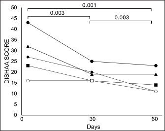 Fig. 2. DISHAA scores in five dogs treated with tPBMT. Scores at 30 and 60 days differed from day 0; scores at 60 days differed from scores at 30 days. The ideal tPBMT treatment protocol for CCD-if one exists-remains unknown. We based our protocol on limited information from rodent AD models and human AD clinical trials (Gonzalez-Lima and Barrett, 2014; Salehpour et al., 2017; Enengl et al., 2020). Although we suspect that twice-a-week treatment may be sufficient, there may be more effective dosing regimens than what we used for our small clinical trial. Since PBMT is considered to have cumulative biological effects (Riegel and Godbold, 2017), it is possible that the initial month of therapy (three treatments per week) served as an induction phase, allowing for twice-a-week therapy in the second month to remain effective. Hopefully, further clinical research into various tPBMT protocols for CCD will help to better establish the most effective protocols for dogs affected by CCD. AcknowledgmentsThe authors wish to thank Multi Radiance Medical for providing the lasers for the study. Conflict of interestThere are no conflicts of interest associated with this investigation. FundingThis study was partially funded by Global Pet Project, INC, a 501c3 non-profit foundation. Authors’ contributionsDr. Dewey was responsible for the study’s inception, case recruitment, study design, and manuscript preparation. Dr. Rishniw conducted data analysis and edited the manuscript. Dr. Gerardi and Dr. Brunke were involved in case recruitment and manuscript editing. Ms. Sakovitch was responsible for client communication, data collection, and manuscript editing. Data availabilityAll data from this investigation are available upon request. ReferencesAilioaie, L.M., Ailioaie, C. and Litscher, G. 2023. Photobiomodulation in Alzheimer’s disease-a complementary method to state-of-the-art pharmaceutical formulations and nanomedicine? Pharmaceutics 15(3), 916. Anders, J.J., Ketz, A.K. and Wu, X. 2017. Basic principles of photobiomodulation and its effects at the cellular, tissue, and system levels. In Laser therapy in veterinary medicine: photobiomodulation. Eds., Reigel, R.J. and Godbold, J.C., Ames, IA: Wiley, pp: 36–51. Barrett, D.W. and Gonzalez-Lima, F. 2013. Transcranial infrared laser stimulation produces beneficial cognitive and emotional effects in humans. Neuroscience 230, 13–23. Chan, A.S., Lee, T.K., Yeung, M.K. and Hamblin, M.R. 2019. Photobiomodulation improves the frontal cognitive function of older adults. Int. J. Geriatr. Psychiatry. 34, 369–377. Chapagain, D., Range, F., Huber, L. and Virányi, Z. 2018. Cognitive aging in dogs. Gerontology 64(2), 165–171. Dewey, C.W., Davies, E.S., Xie, H. and Wakshlag, J.J. 2019. Canine cognitive dysfunction: pathophysiology, diagnosis, and treatment. Vet. Clin. Small Anim. Pract. 49, 477–499. Dewey, C.W., Rishniw, M., Johnson, P.J., Platt, S., Robinson, K., Sackman, J. and O’Donnell, M.O. 2020. Canine cognitive dysfunction patients have reduced total hippocampal volume compared with aging control dogs: a comparative magnetic resonance imaging study. Open Vet. J. 10, 438–442. Dewey, C.W., Brunke, M.W. and Sakovitch, K. 2022. Transcranial photobiomodulation (laser) therapy for cognitive impairment: a review of molecular mechanisms and potential application to canine cognitive dysfunction (CCD). Open Vet. J. 12, 256–263. Enengl, J., Hamblin, M.R. and Dungel, P. 2020. Photobiomodulation for Alzheimer’s disease: translating basic research to clinical application. J. Alzheim. Dis. 75, 1073–1082. Gonzalez-Lima, F. and Barrett, D.W. 2014. Augmentation of cognitive brain functions with transcranial lasers. Front. Syst. Neurosci. 8, 36. Gonzalez-Martinez, A., Rosado, B., Pesini, P., Garcia-Belenguer, S., Palacio, J., Villegas, A., Suarez, M.L., Santamarina, G. and Sarasa, M. 2013. Effect of age and severity of cognitive dysfunction on two simple tasks in pet dogs. Vet. J. 198(1), 176–181. Hamblin, M.R. 2016. Shining light on the head: photobiomodulation for brain disorders. BBA Clin. 6, 113–124. Hamblin, M.R. 2019. Photobiomodulation for Alzheimer’s disease: Has the light dawned? Photonics 6(3), 77. Hennessy, M. and Hamblin, M.R. 2017. Photobiomodulation and the brain: a new paradigm. J. Opt. 19(1), 013003. Landsberg, G.M., Nichol, J. and Araujo, J.A. 2012. Cognitive dysfunction syndrome: a disease of canine and feline brain aging. Vet. Clin. Small Anim. 42, 749–768. Lapchak, P.A. 2012. Transcranial near-infrared laser therapy applied to promote clinical recovery in acute and chronic neurodegenerative diseases. Expert. Rev. Med. Devices. 9, 71–83. Mintzopoulos, D., Gillis, T.E., Tedford, C.E. and Kaufman, M.J. 2017. Effects of near-infrared light on cerebral bioenergetics measured with phosphorous magnetic resonance spectroscopy. Photomed. Laser Surg. 35, 395–400. Naeser, M.A., Zafonte, R., Krengel, M.H., Martin, P.I., Frazier, J., Hamblin, M.R., Knight, J.A., Meehan, W.P. and Baker, E.H. 2014. Significant improvements in cognitive performance post-transcranial, red/near-infrared light-emitting diode treatments in chronic, mild traumatic brain injury: open-protocol study. J. Neurotrauma. 31, 1008–1017. Pan, Y., Landsberg, G., Mougeot, I., Kelly, S., Xu, H., Bhatnagar, S., Gardner, C.L. and Milgram, N.W. 2018. Efficacy of a therapeutic diet on dogs with signs of cognitive dysfunction syndrome (CDS): a prospective double blinded placebo controlled clinical study. Front. Nutr. 12(5), 1–10. Riegel, R.J. and Godbold, J.C. 2017. Fundamental information. In Laser therapy in veterinary medicine: photobiomodulation. Eds., Reigel, R.J. and Godbold, J.C., Ames, IA: Wiley, pp: 9–18. Salehpour, F., Ahmadian, N., Rasta, S.H., Farhoudi, M., Karimi, P. and Sadigh-Eteghad, S. 2017. Transcranial low-level laser therapy improves brain mitochondrial function and cognitive impairment in D-galactose-induced aging mice. Neurobiol. Aging. 58, 140–150. Sa