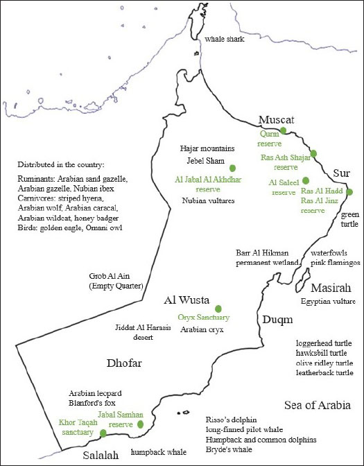 Fig. 1. Sultanate of Oman: study region map: areas of nature reserves and indicative wildlife distribution. Another important activity for protecting wild fauna is focused on sea turtles. Ras Al Hadd and Ras Al Jinz, in Ash Sharqiyah district, are monitored reproduction sites of green turtles ( Chelonia mydas, Linnaeus, 1758) (Fig. 6) under the competence of the Environment Authority and in collaboration with the Ministry of Tourism and the Oman Tourism Development Company (OMRAN), a government-owned company. The sites are located on the Oman coast on the Indian Ocean, which includes a strategic 142 km, with several female turtles arriving every night, especially during the peak period. Oman is the second reproduction site in the world for marine green turtles (Chelonia mydas), after Australia (Dobbs, 2007). At the Al Ras Hadd station beach of 7 km, surveillance is ensured by 11 rangers and two staff from the Ministry of Tourism, operating in groups of four. Activities encompass monitoring the reproduction site, marking, and measurements, education, assistance to laying females and hatching turtles, and evacuation of turtle carcasses. From 6 pm to 5.30 am, access to beaches within a range of 300 mt from the seashore is forbidden. Human presence and activities are restricted to the local community of fishermen. Two staff groups start at 5.30 pm rounds to warn people to leave the site, informing briefly about the exigences of female turtles during the delicate lying season (June-September – peak June-July), so undertaking basic divulgation/education activities against main disturbance factors (e.g., presence of persons, vehicles, and lights). During the night, the staff observe most of the arrivals beginning after 9 pm. Five to six females per day are tagged and measured (to determine the age). In 40 years, 66,616 tags have been used.