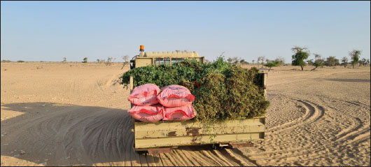 Fig. 11. Rangers looking at an hunted Oryx, after chasing poachers. Arabian Oryx Reserve, Al Wusta Directorate, Sultanate of Oman, 1996. Source: Office for conservation of environment. Other threats that require effective preventive actions include the degradation of the natural environment due to human activities, such as the exploitation of natural resources, like fossil fuels as it is the case in Oman for oil and natural gas extraction, with subsequent pollution, reducing and hampering habitats where wild fauna lives, or climate changes that might alter the complex equilibrium of deserts and sea. Current Initiatives and Future ProspectsThe delicate equilibrium of wild fauna in Oman requires to be studied and supported. Two main areas of research and intervention refer to the reintroduction of the ungulates held in captivity at the Oryx Sanctuary into the natural environment, and the second field of interest is the protection and improvement of reserves dedicated to sea turtles. As demonstrated by previous surveys, the potential for a high density of wild ungulates, such as gazelles, relies on well protected and productive habitats, to avoid decline due to most likely a result of poaching and competition with domestic livestock (Al Jahdham et al., 2017). This implies the preservation of natural areas suitable to sustain wild populations or to receive animals breed in captivity for repopulation, including fighting against poaching and preventing the spread of diseases from domestic animals. For example, field observations allowed us to identify the natural habitat of the Nubian ibex in Oman, a restricted area close to the Arabian oryx sanctuary, on the mountains between Haima and Duqm in the Al Wusta governorate. Nevertheless, recent mining activities started in this area, hampering this identified precious territory. It is, therefore, important to issue specific legal provisions (in line with the empowerments of the Environment Authority) to preserve intact the ecosystem of the Nubian ibex and other wild species that existed in that particular area to avoid its disappearance. In addition, only limited information is available on diseases occurring in these species (Goraya et al., 2021). On their husbandry and management requirements (this included the consideration of green products, guaranteed against poaching and illegal trade, such as the recuperation of antlers from deceased antelopes), as well as repopulation strategy; therefore, research should be undertaken on these topics. For example, protocols for rapid release in the wild should be studied, eventually considering the constitution of animal groups after weaning, for a pre-adaptation period to natural feeding to facilitate animals ready for self-sustaining upon release, considering that captive animals are fed with forage and supplemented with concentrates and salt (Fig. 13). Similarly, studies should be conducted for the selection of areas to be repopulated and the measures to be taken to protect reintroduced animals in selected territory (water points, ranger monitoring, legal instruments). Concerning domestic animals, 70% of Omani domestic animals are present in Dhofar (Ministry of Agriculture, 2011; FAO, 2021), due to the favorable climate and availability of large pastures. The 225,000 bovines ( Bos taurus, Linnaeus, 1758) and the 187,000 dromedaries ( Camelus dromedarius , Linnaeus, 1758) constitute the majority of the zootechnic resources of the region, along with less than 100,000 goats ( Capra hircus, Linnaeus, 1758) and donkeys ( Equus asinus, Linnaeus, 1758) (data not published). No prophylactic programs are in place, and farmers are culturally averse. Pastures are freely shared by the different domestic species (Fig. 14). Therefore, due to promiscuity, no barrier exists to impede the spread of diseases among them. Also, natural reserves are used as pastures by farmers. Thus, diseases may spread indirectly from domestic animals to wild fauna. In addition, the high density of domestic animals may represent an epidemiological risk factor, facilitating the circulation of diseases. This may have an impact on animal health in the rest of the county. Even if the trade of live animals from Dhofar to other governorates might be limited, only a few animals are sufficient to introduce pathogens in hosting animal herds.